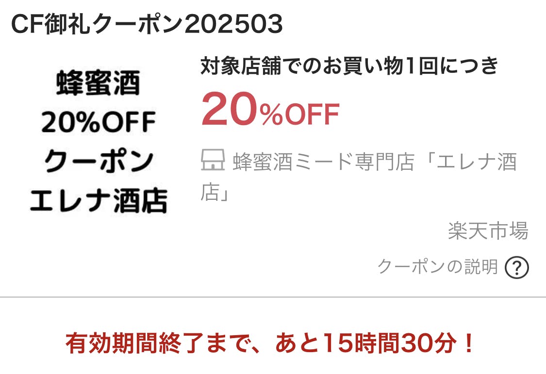 2025/03/09 08:40【数量限定フルーツミード50本】・【ミード全品20%OFFクーポン】おはようございます。ディアレットフィールド醸造所の工藤エレナです。フルーツミードのご支援いただき、誠にありがとうございます!【限定発売】楽天「エレナ酒店」にてブルーベリーミードとブドウミードの限定50本ずつの発売開始!このたび、ご支援いただいた方を優先にご案内させていただいております。そして、醸造所直営「エレナ酒店」の店内全品20%OFFクーポン付きです!!この機会にさまざま味わいのミードをお試しください♪▼エレナ酒店https://www.rakuten.co.jp/elena-sake/【店内全品20%OFFクーポン付き】有効期間: 3/8(土)20:30〜3/9(日)23:59▼下記URLよりクーポン取得が可能https://coupon.rakuten.co.jp/getCoupon?getkey=R0FEUS1ZMU5RLUxIUEYtRlpBVQ--&rt=【楽天のクーポンコード】Y1NQ-GADQ-LHPF-FZAU▼ブルーベリーミードhttps://item.rakuten.co.jp/elena-sake/dfbmead-fruitmead1/▼ブドウミードhttps://item.rakuten.co.jp/elena-sake/dfbmead-fruitmead2/そのほかDFBミード▼https://www.rakuten.co.jp/elena-sake/これからも様々な果実でフルーツミードに挑戦していきたいと思います。【フルーツミード定期便】も検討中のため、またお知らせいたします!春になってきましたら、秩父の山奥、あたたかい小鹿野で楽しくオリジナルミード造りもおすすめです!https://meadery.jp/brewing/引き続き、ご愛顧のほどよろしくお願いします。ディアレットフィールド醸造所工藤エレナ もっと見る【限定発売】フルーツミード!20%OFFクーポン!