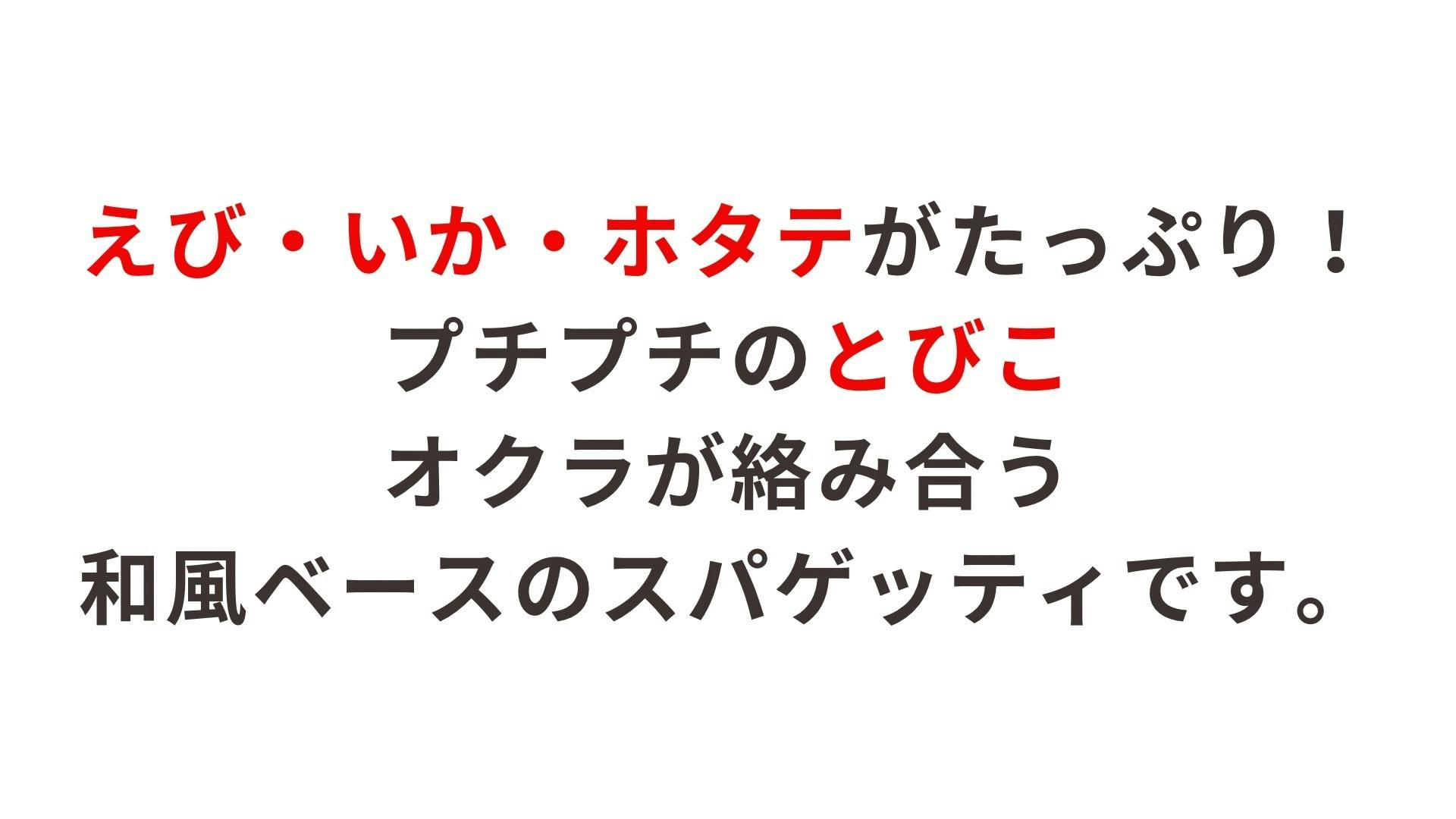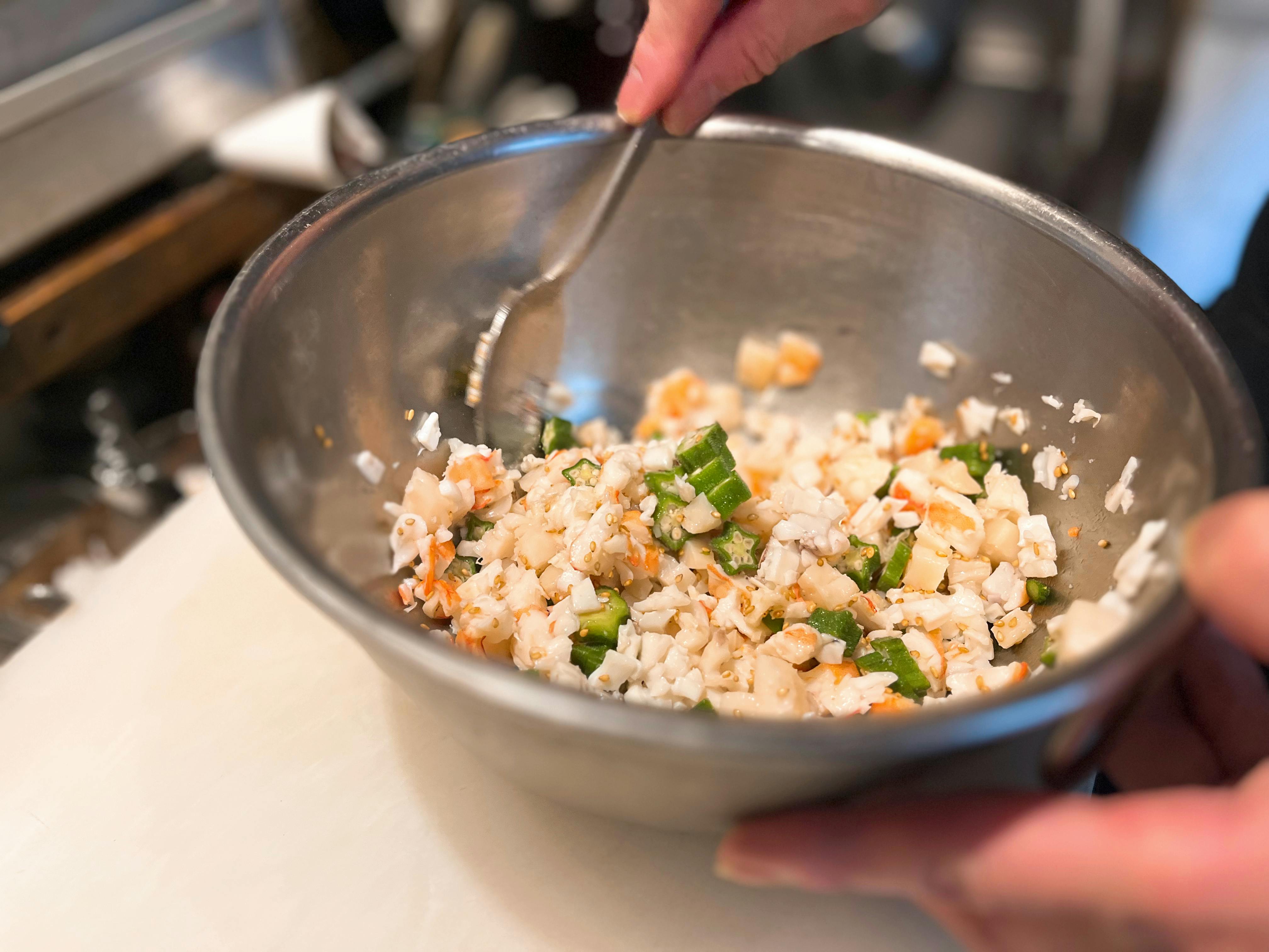 具材は、えび・いか・ホタテ・おくら。海鮮は、生臭くないようしっかり下処理を行い、うま味たっぷりです。