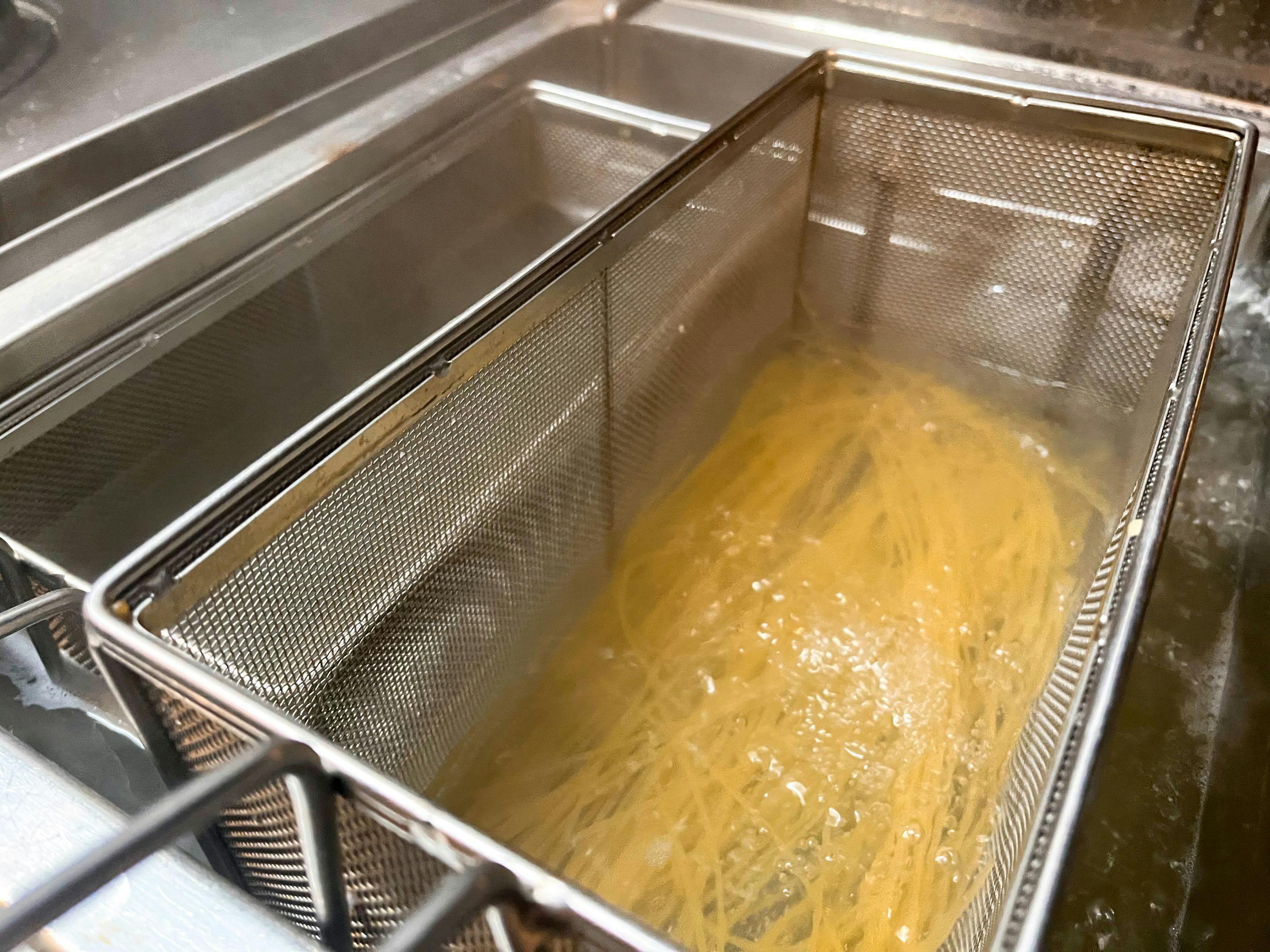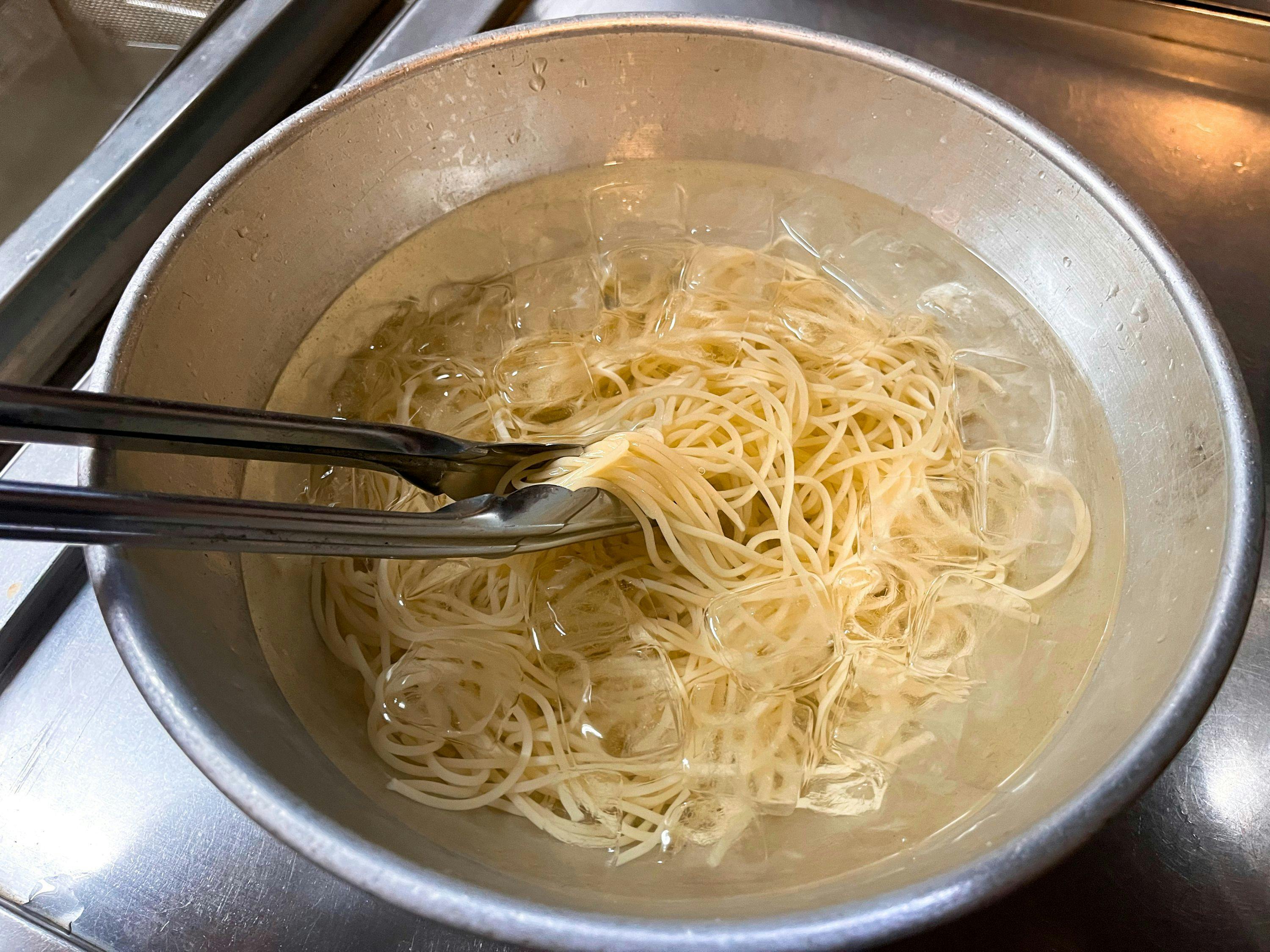パスタをゆでていきます。ゆであがったら氷水でしっかり冷やすのがポイント。