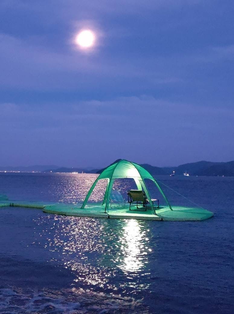 アクラスラーは、これまでにない新しい水上体験ができる浮島です。今回は、アクラスラーを体験いただけるプライベートビーチを岡山県にご用意しました。