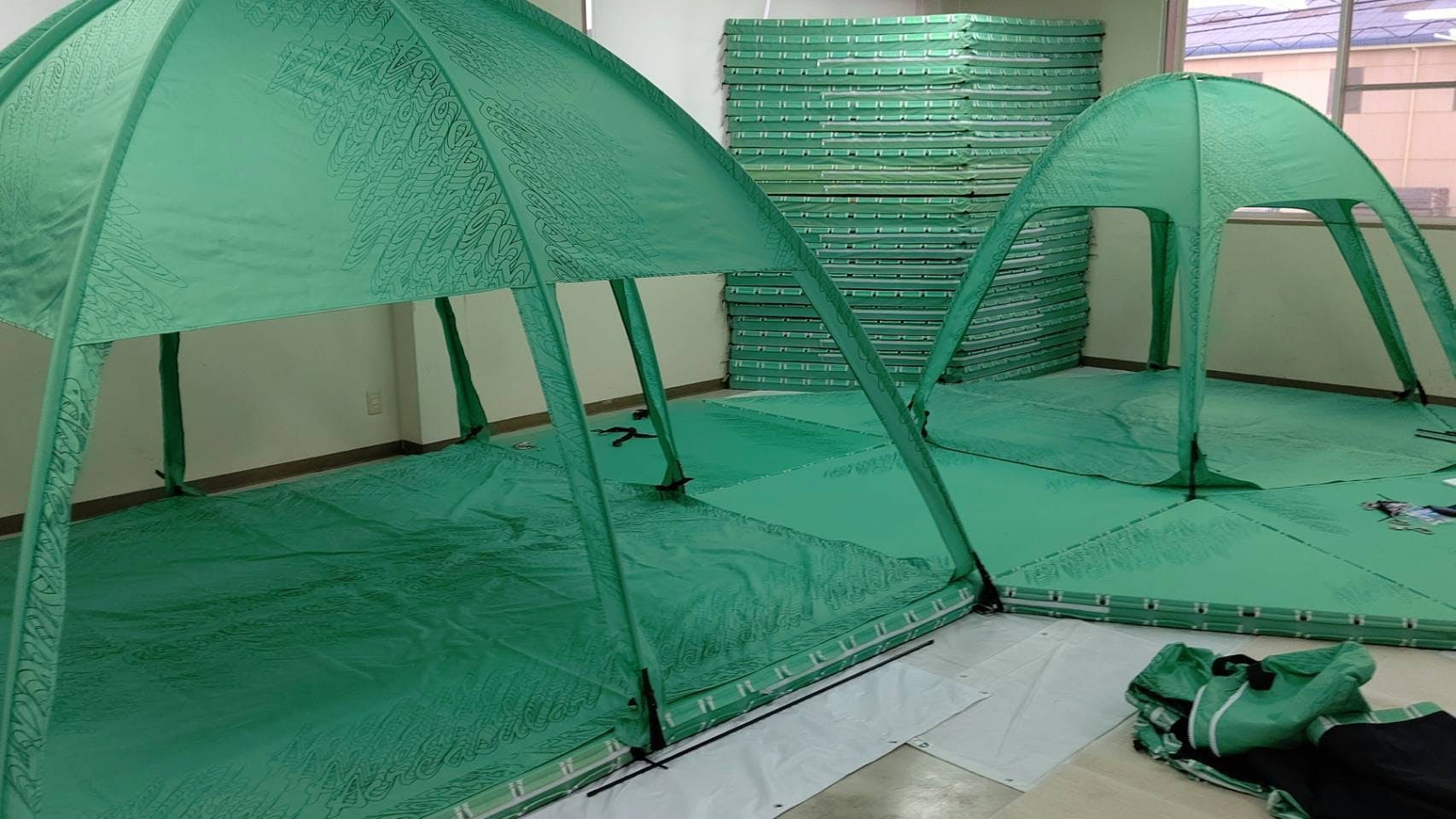 アクラスラーの上にテントをたて、アウトドア用ソファとローテーブルを設置しても、安定してお酒片手にゆったり過ごせます。