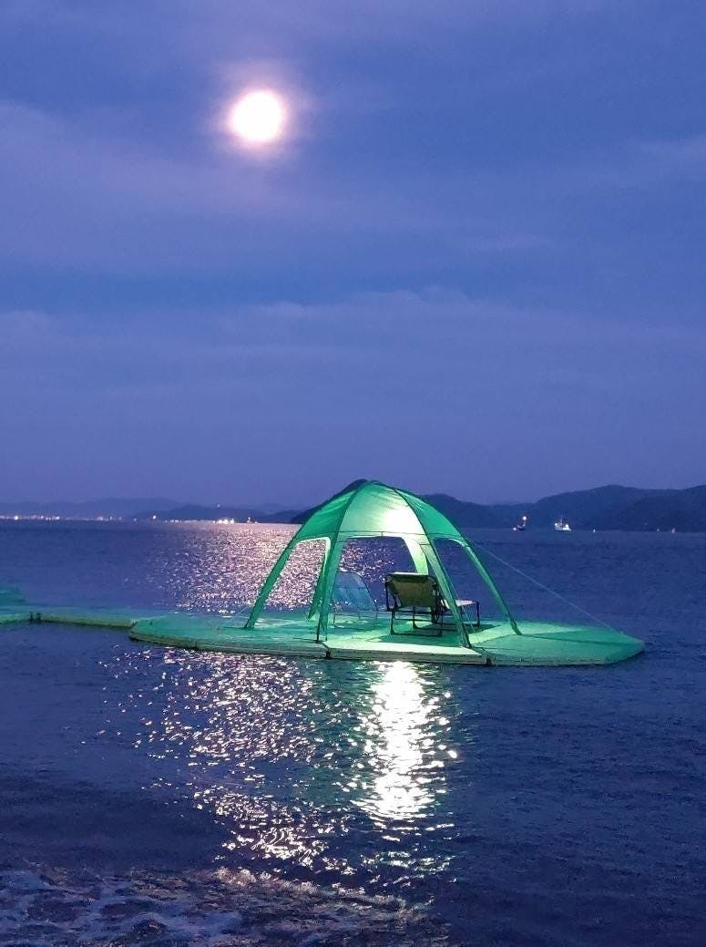 『水上で家族や友人とともに優雅に過ごせる快適な空間』をコンセプトに、水に浮かぶ浮島『アクラスラー』を開発しました。私たちはアウトドア・インドア商品の開発をしてきました。この新感覚のゆったりとした体験を日本中の皆さまにしていただきたく、岡山県のプライベートビーチにて体験イベントを開催します。
