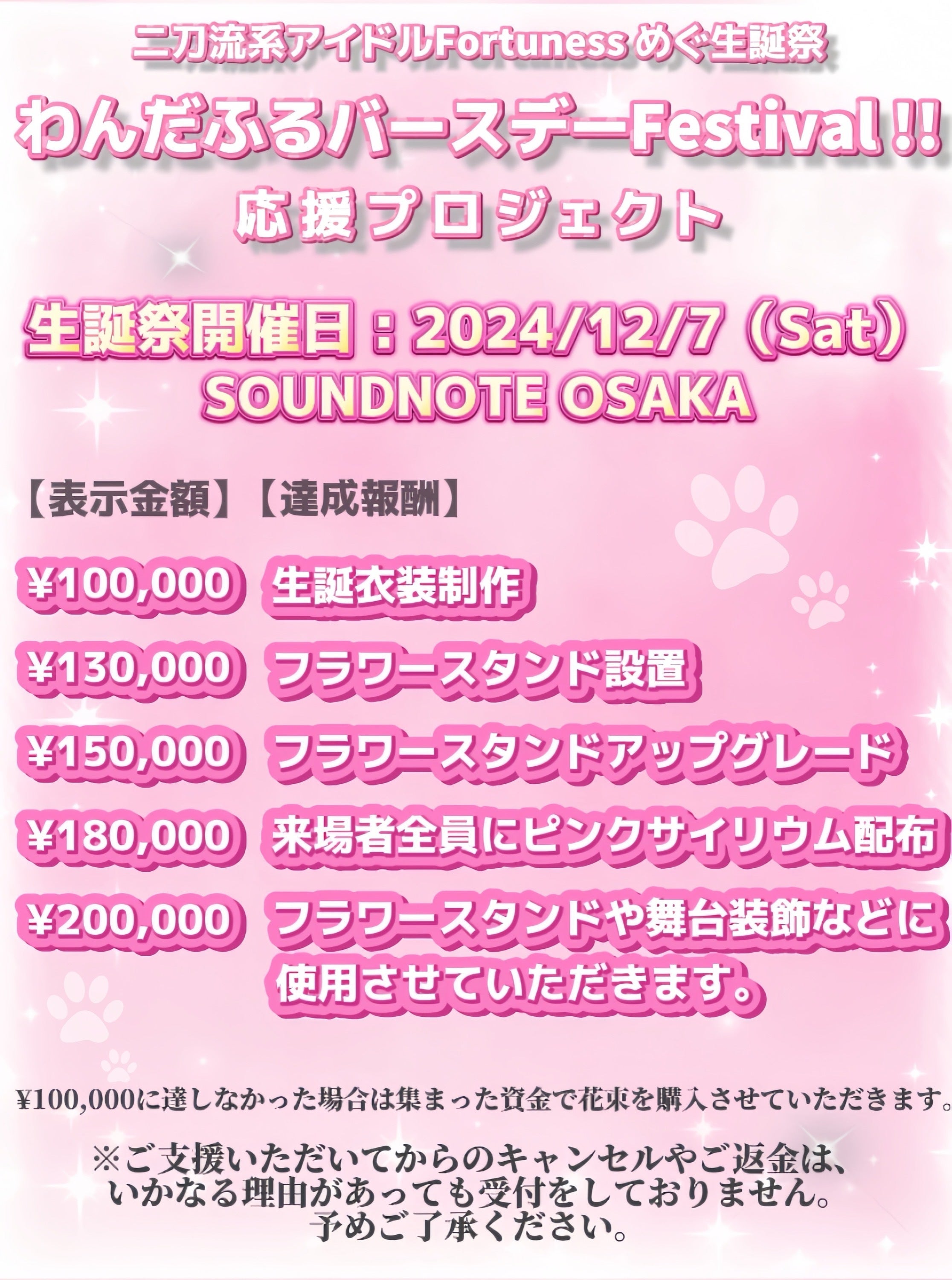 従来、有志の皆様がカンパを募集し、ワンマンライブのフラワースタンドなどの装飾品やプレゼントの費用を集める習慣がございましたが、ファンの皆様の平等性を担保し、新規の方も気軽にワンマンライブに参加できるような体制に変更すべく、このような一律の募集を行うことになりました。