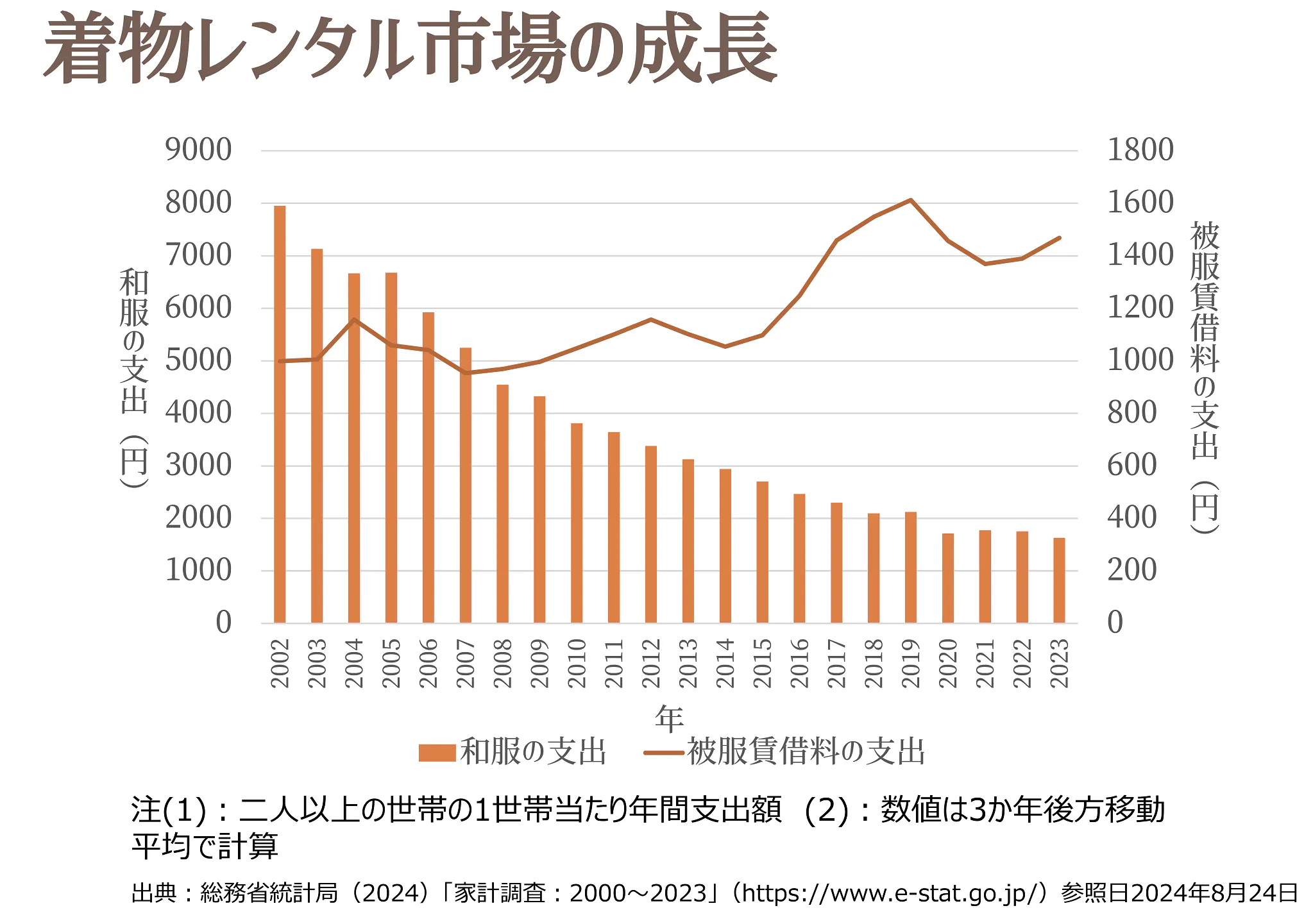 このように着物をレンタルして遊びに出かけるケースも含めて、着物の普段使いの頻度を問い、それを着物に対する需要の大きさを測る指標の一つとして使います。