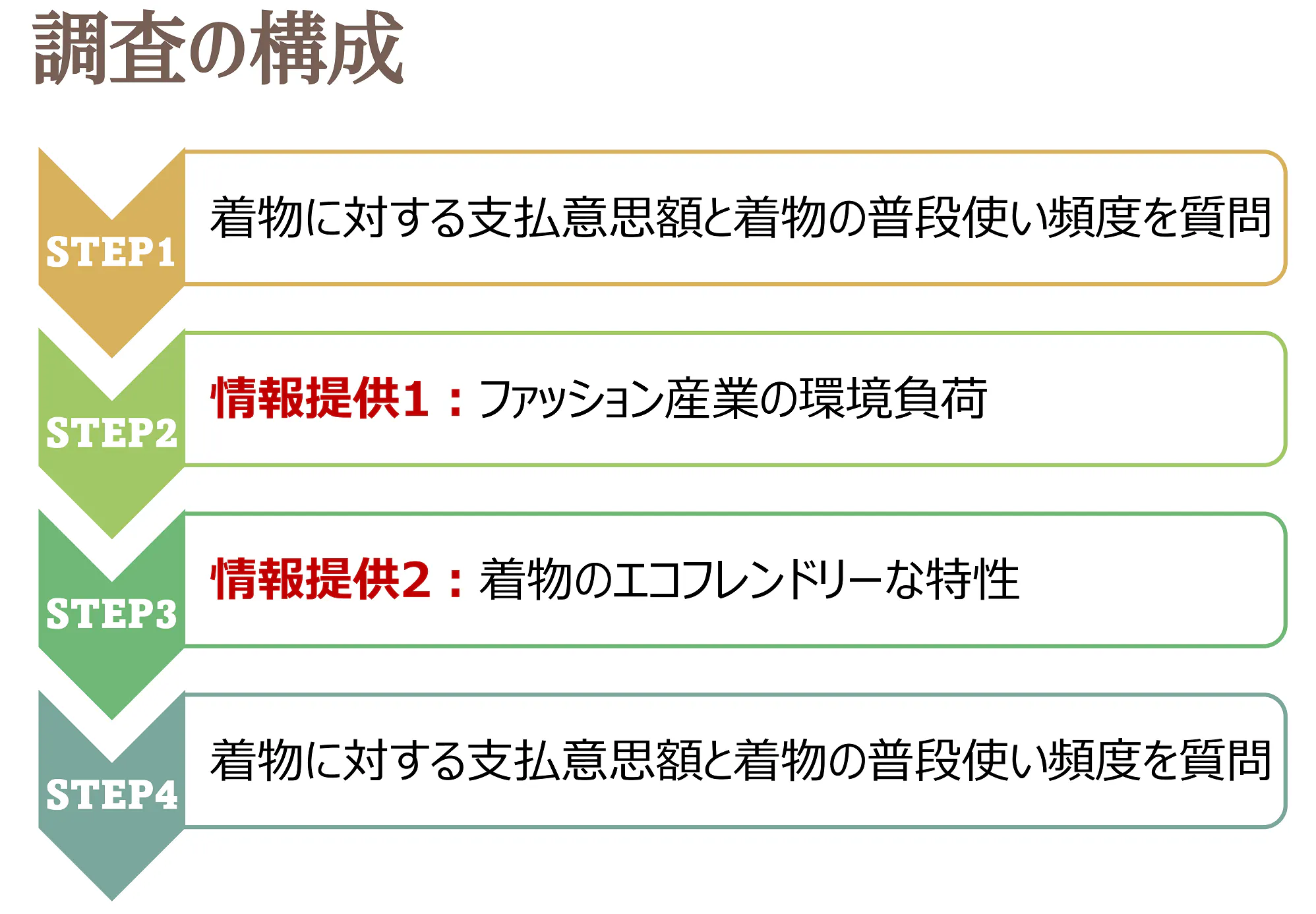 この知見を踏まえ、今回私たちはESDの観点から(1)現代のファッション産業が引き起こす環境負荷と(2)着物のエコフレンドリーな特性を情報として広く伝え、それが人々の着物に対する需要をどれほど高めるかを分析します!