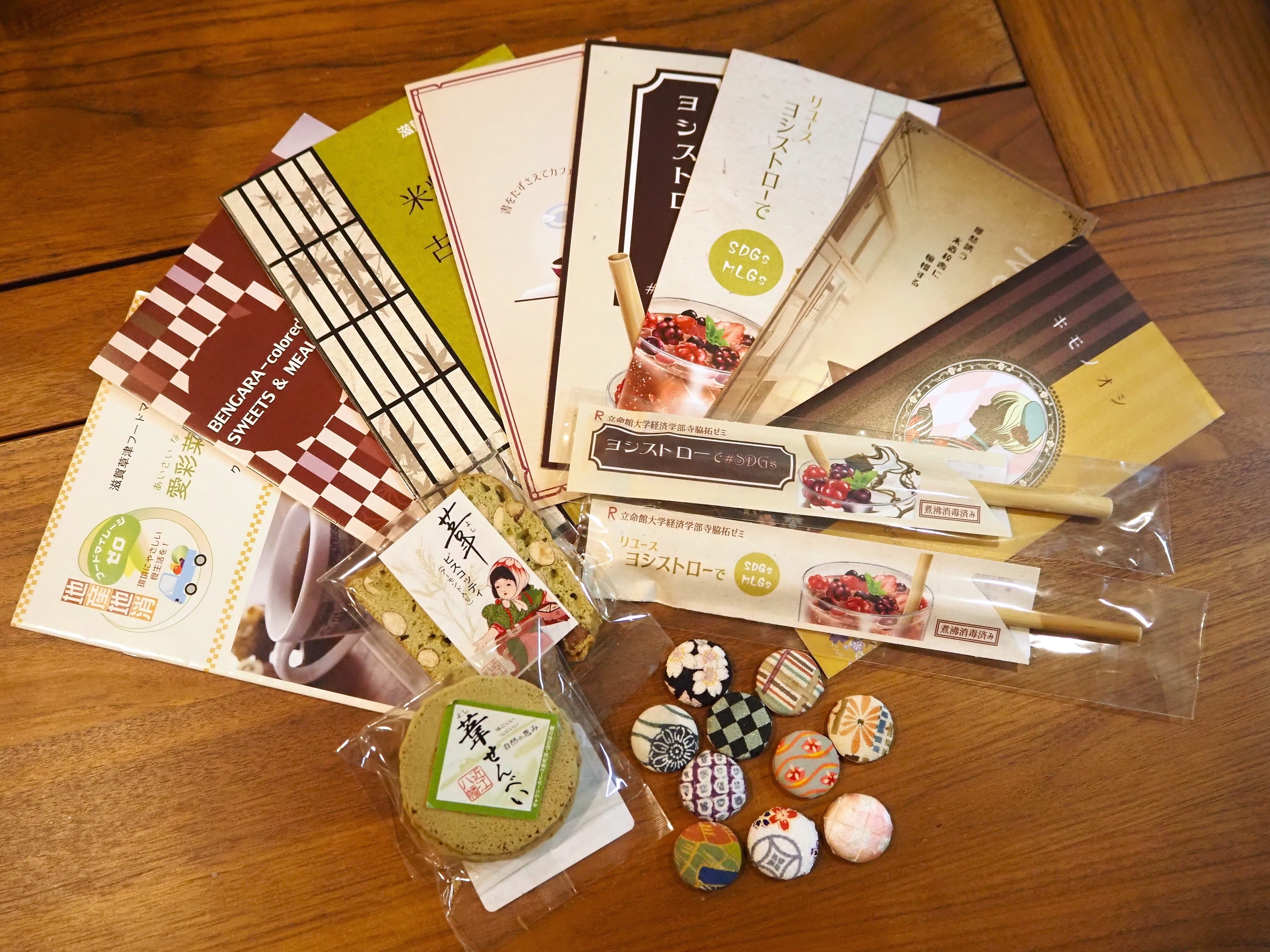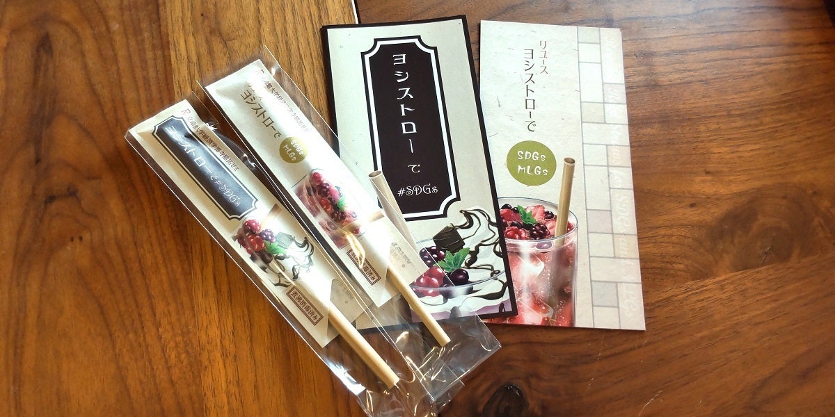 2019年度と2022年度にそれぞれ作成したヨシストローの紹介パンフレット「ヨシストローで#SDGs」(フルカラー、A4巻き三つ折り)と「リユースヨシストローでSDGs・MLGs」(フルカラー、A4巻き三つ折り)も付いてきます。