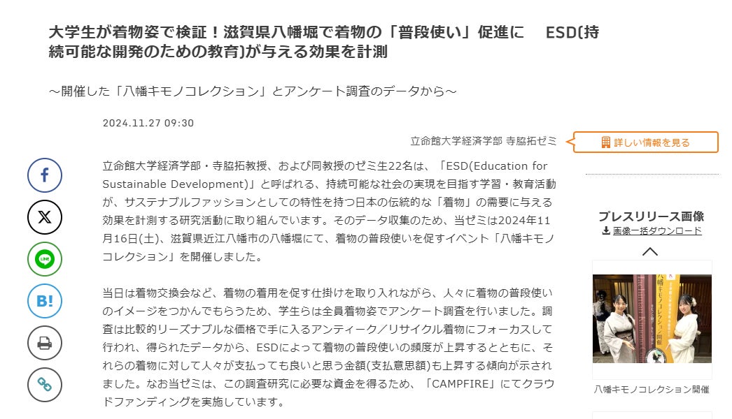 @Press様よりプレスリリースが配信されました!▶大学生が着物姿で検証!滋賀県八幡堀で着物の「普段使い」促進にESD(持続可能な開発のための教育)が与える効果を計測記事には現時点での結果の速報を入れております。八幡キモノコレクションで集めたアンケートデータから、ESDによって普段使いとしての着物の着用頻度とアンティーク/リサイクル着物に対する支払意思額が上昇することが統計的に示されました!引き続き京都市内で調査を行う予定ですので、続報をお待ちください!