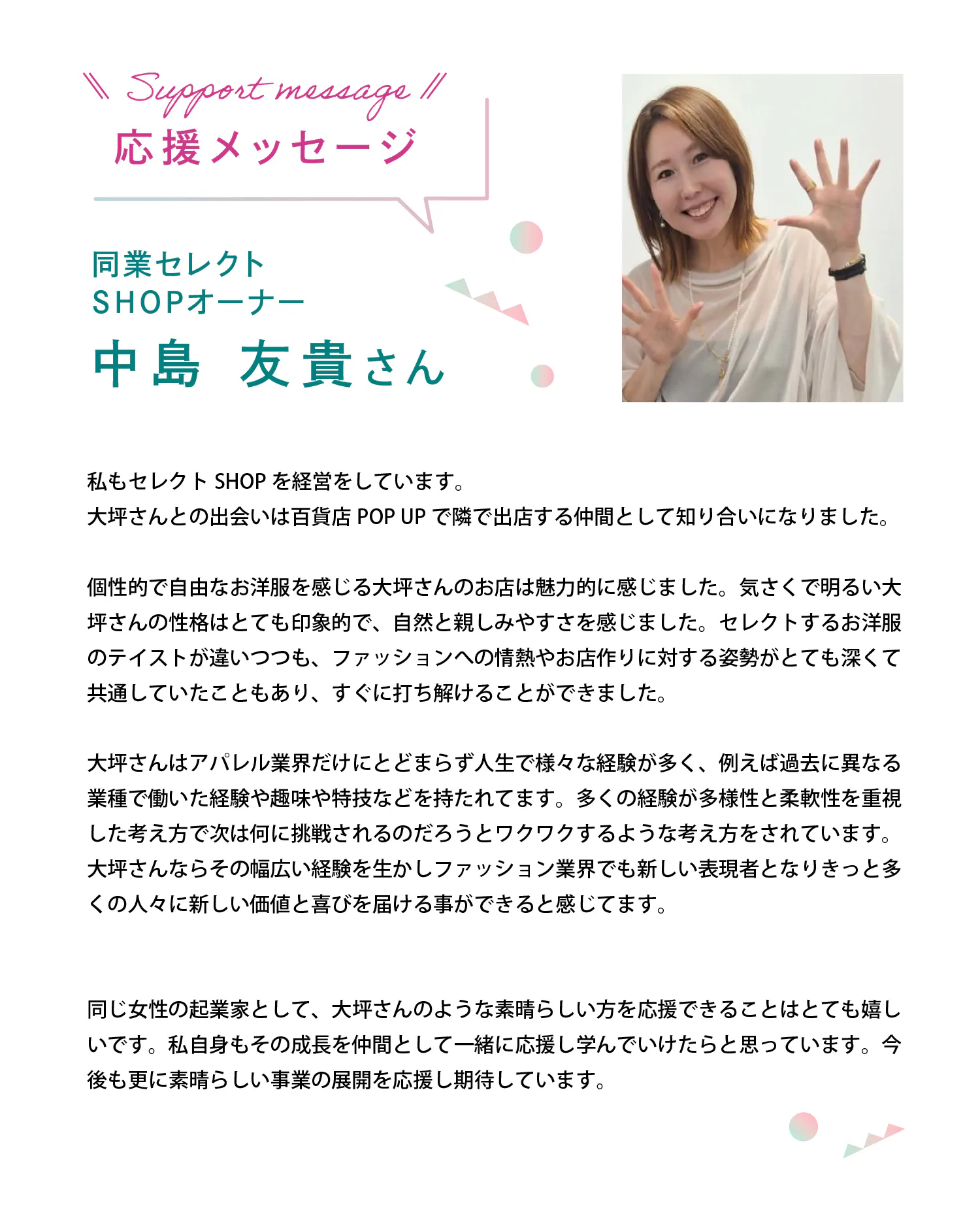 さらに、支援者の皆様と直接交流できる機会として、ファッションやEC運営に関する勉強会を開催したいと考えています。私たちが得た経験や知識を共有し、皆様の支援にお応えできるよう、学びの場も提供していきたいです。どうぞ応援よろしくお願いいたします!
