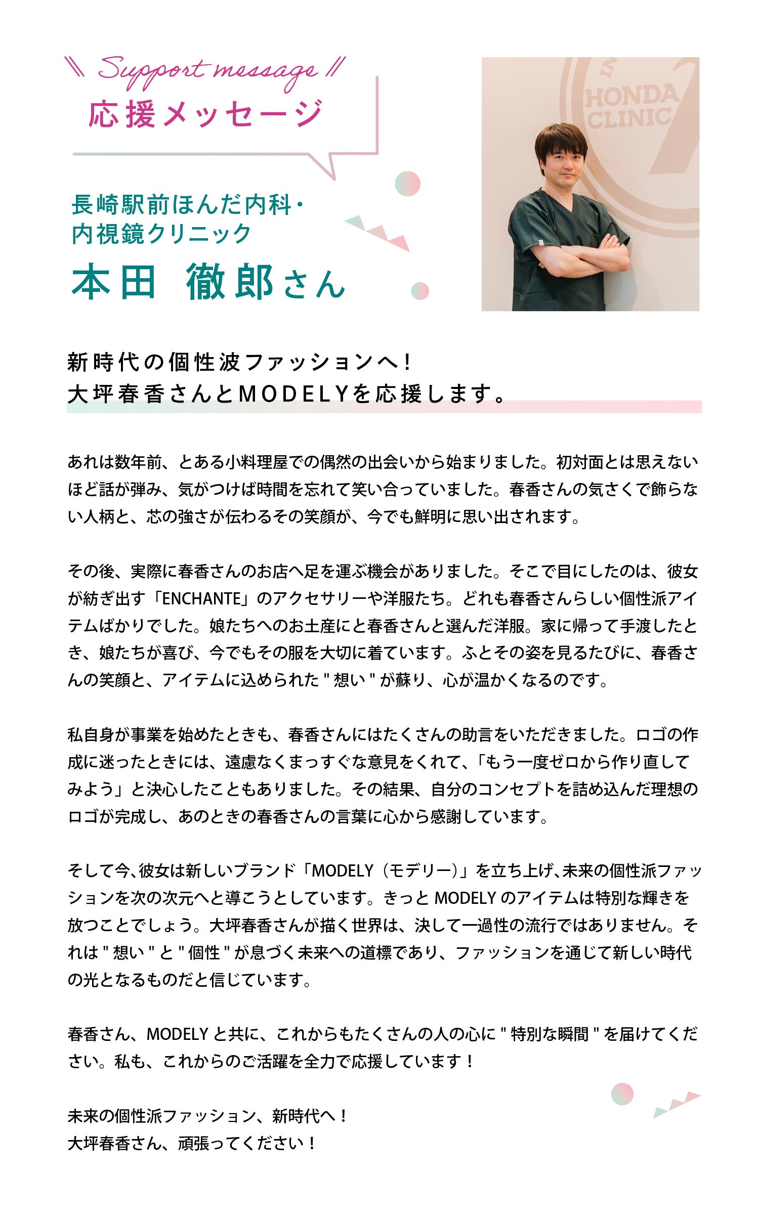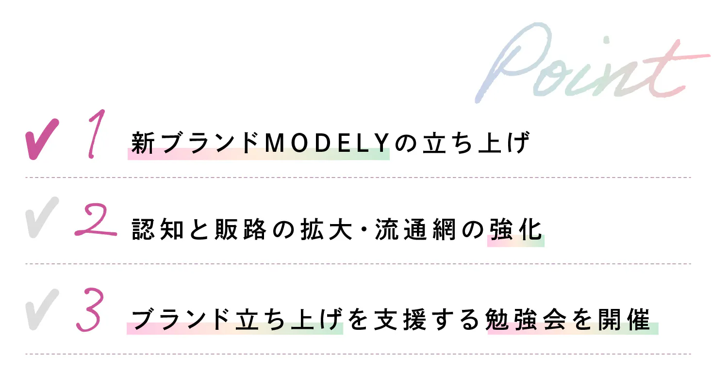新ブランド・MODELYの立ち上げにあたり、これまでポップアップイベントを通じて多くのお客様と直接触れ合ってきました。しかし、接客スキルや商品知識の差により、ブランドの魅力を均一に伝えることの難しさを感じてきました。そこで、MODELYではECサイトを活用し、誰にでも正確で安定した情報を均一に届ける仕組みを構築します。そうする事ですべてのお客様にブランドの価値を正しく伝え、信頼されるブランド作りを目指しています。