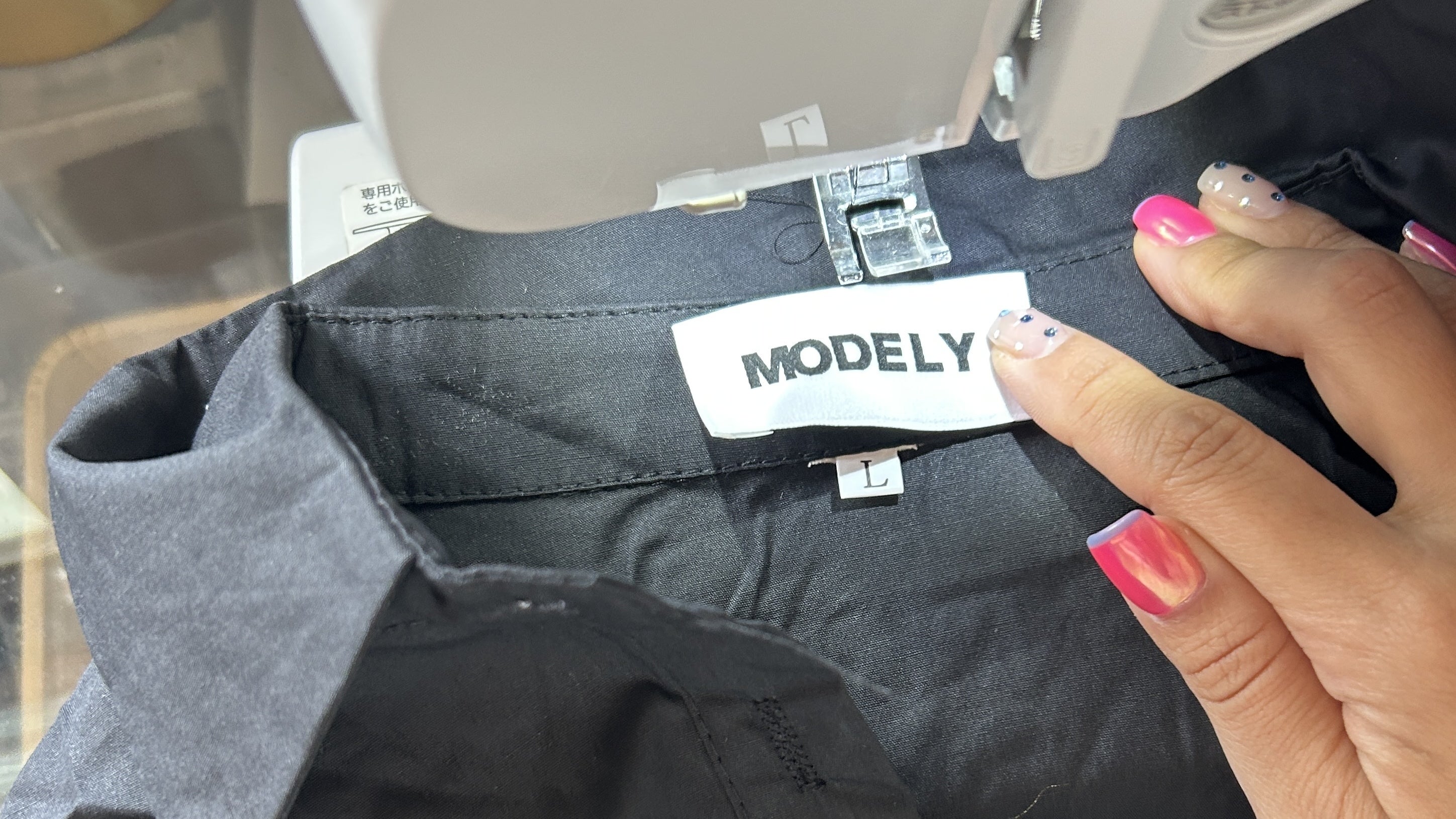 商品一つひとつに「MODELY」のブランドタグを手作業で取り付けています。