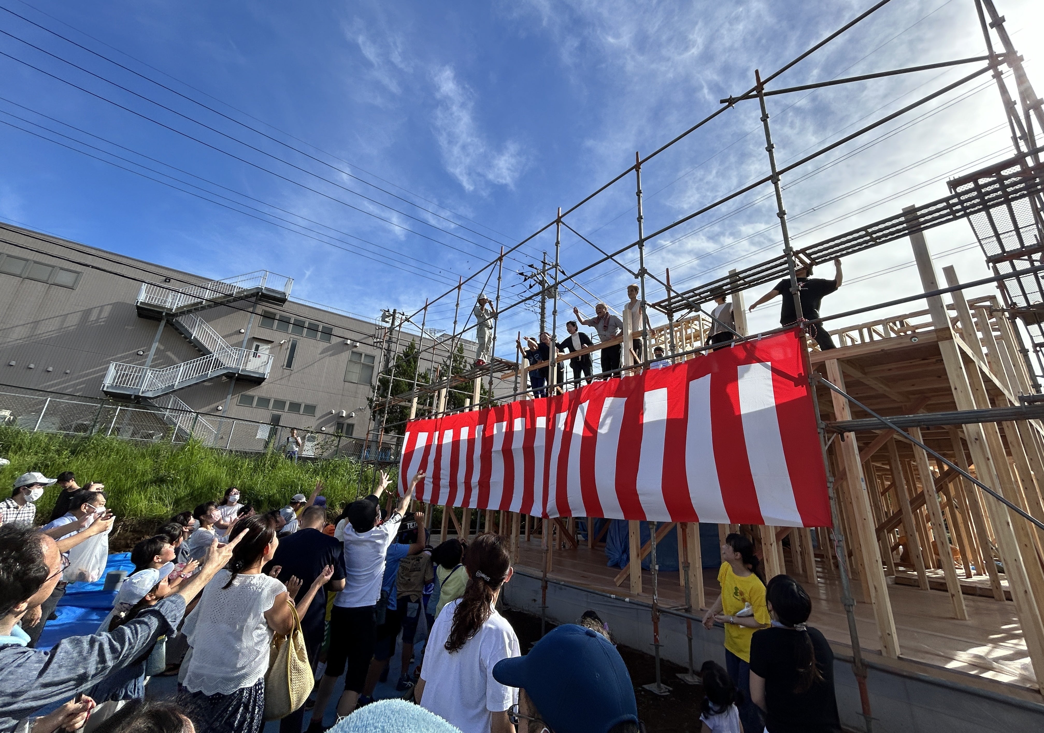 上棟をお祝いして、上棟式(建前)を行いました。おひねりやお菓子をまきました。