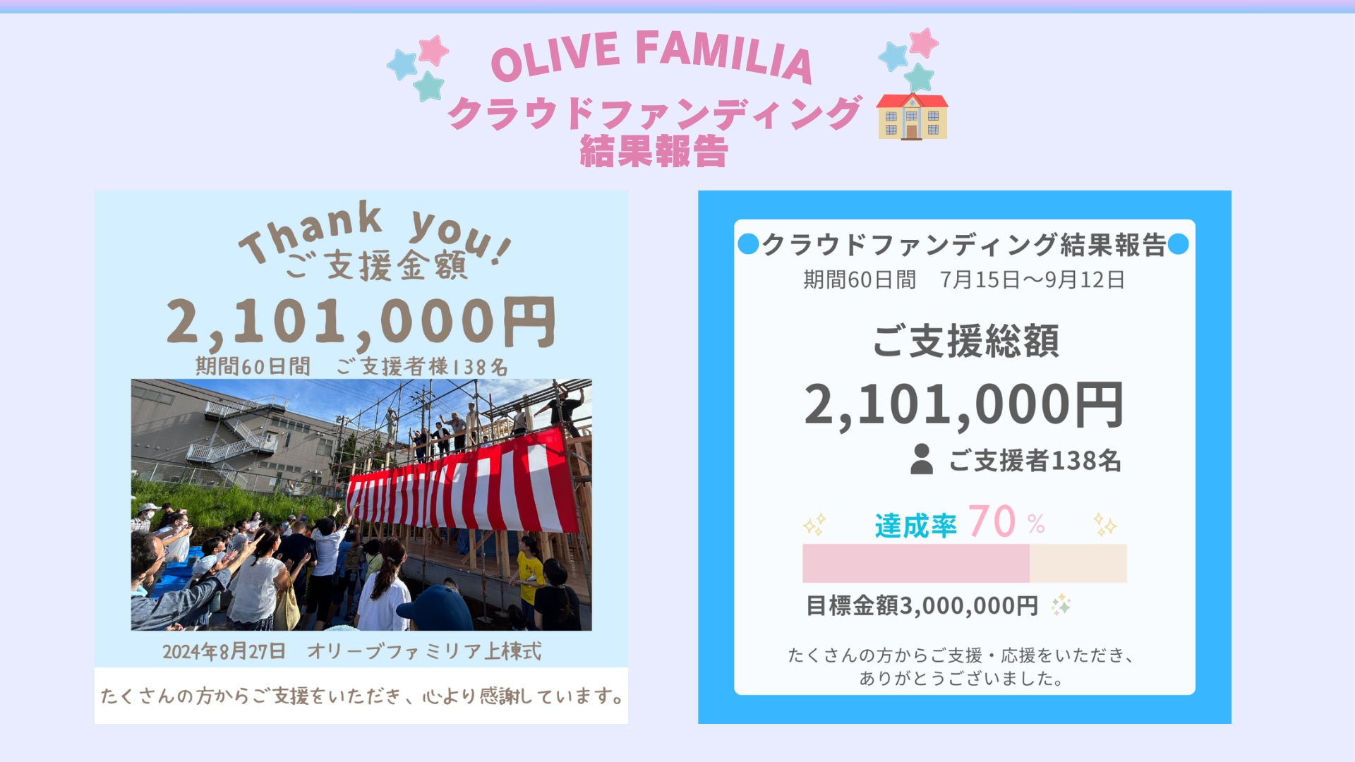 総支援額2,101,000円、138名の支援者の方から温かいご支援をいただきました。心より感謝しております。
