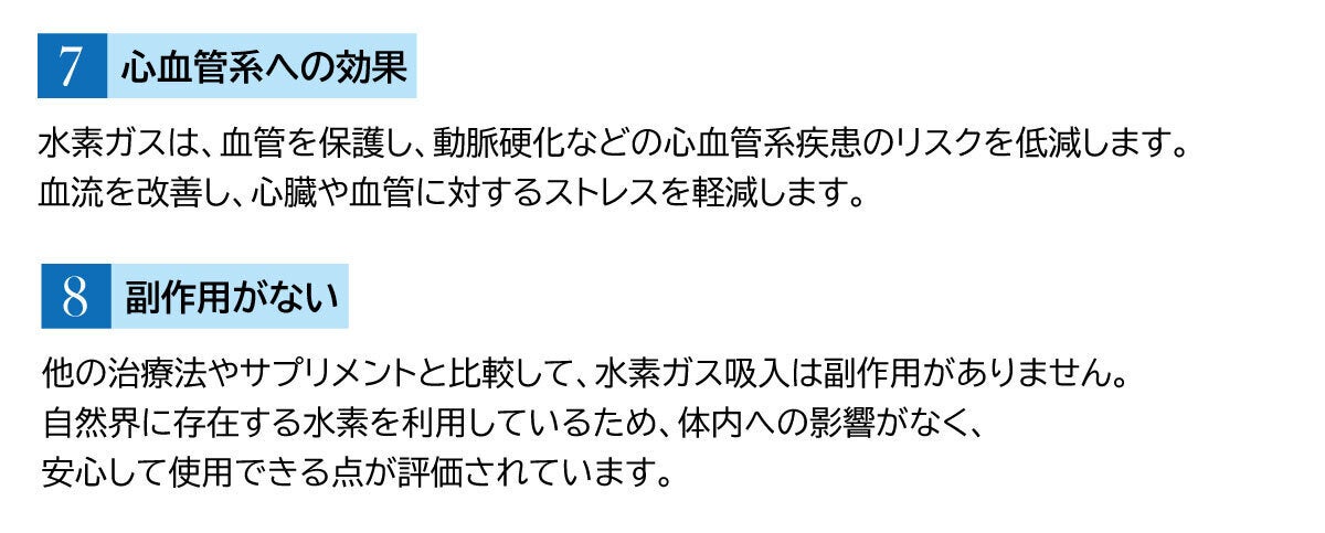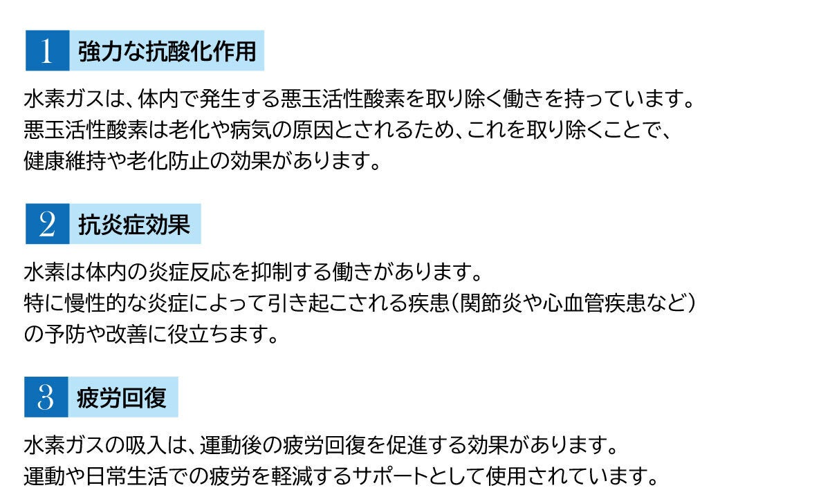 水素ガス吸入の利点は、抗酸化作用や抗炎症作用が注目されており、健康や美容の分野で期待されています。以下に主な利点をまとめます。