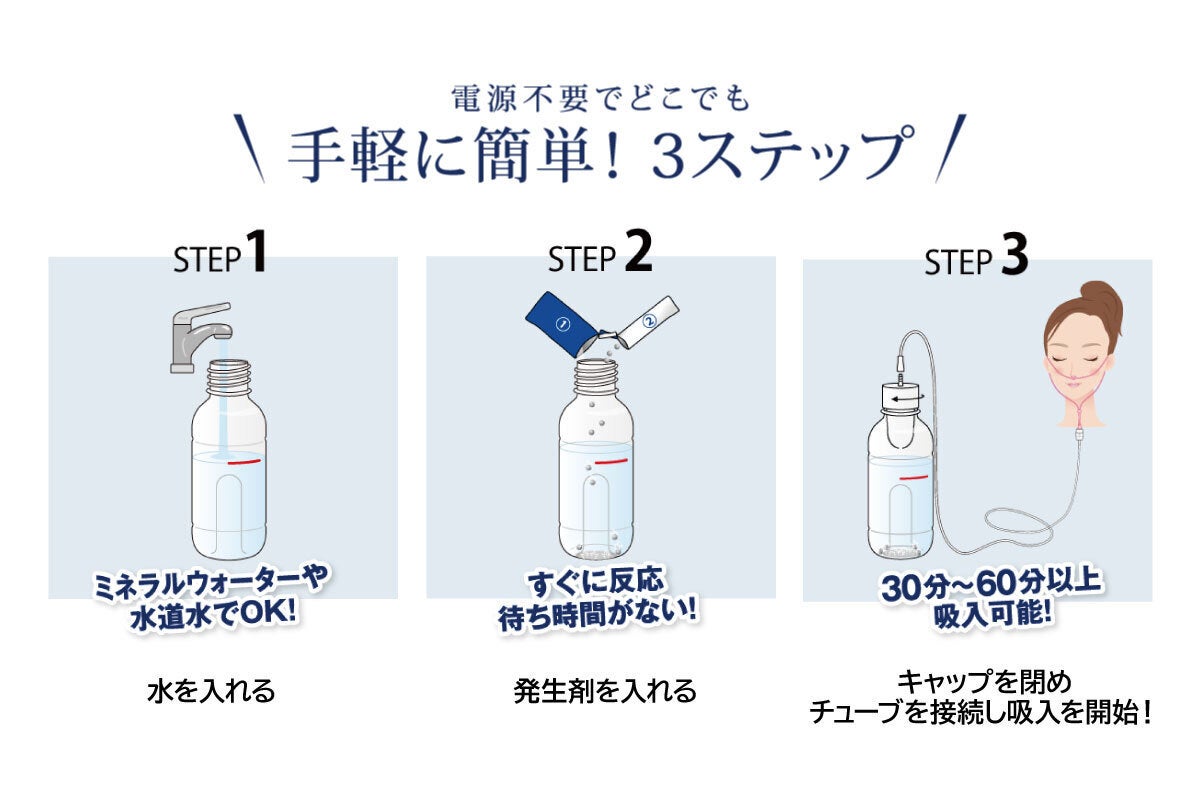 水素発生剤、水素発生促進剤、専用ボトル、延長チューブ、中継カプセル、鼻カニューラ、フィルターカプセル、フィルター、ボトルスタンド、ボトルスタンド充電用USBケーブル
