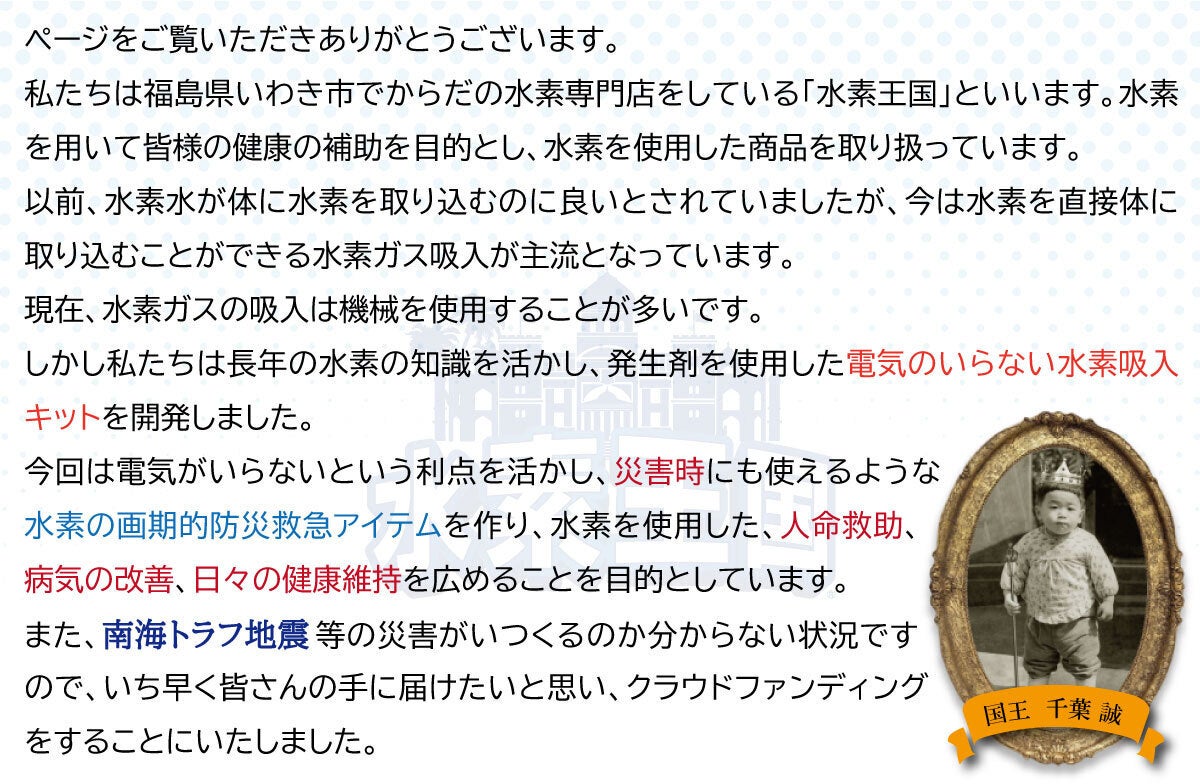 今回私たちが提供したいと考えている「水素deレスキュー」は以前から販売している「水素すったら」と同じ、発生剤を使用して水素ガスを発生させる方式なので、電源のない災害時でもすぐに使用することが可能です。