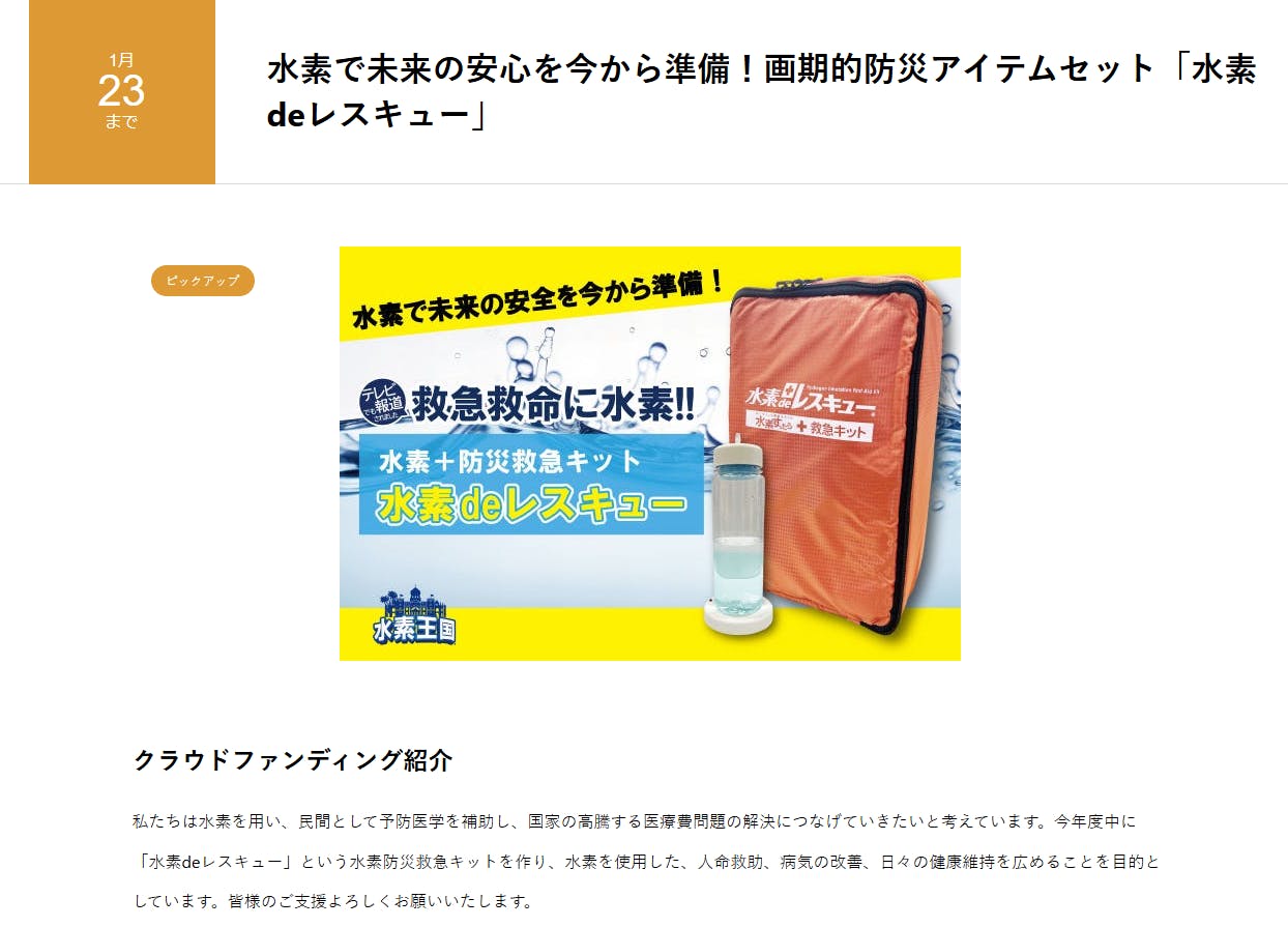 2024/11/18 11:32クラウドファンディング名鑑に掲載されました!まだまだ始めたばかりで不安な中ご担当の方からお声がけいただきました。少しでも多くの方に「水素deレスキュー」を知ってもらえたら嬉しく思います! もっと見る