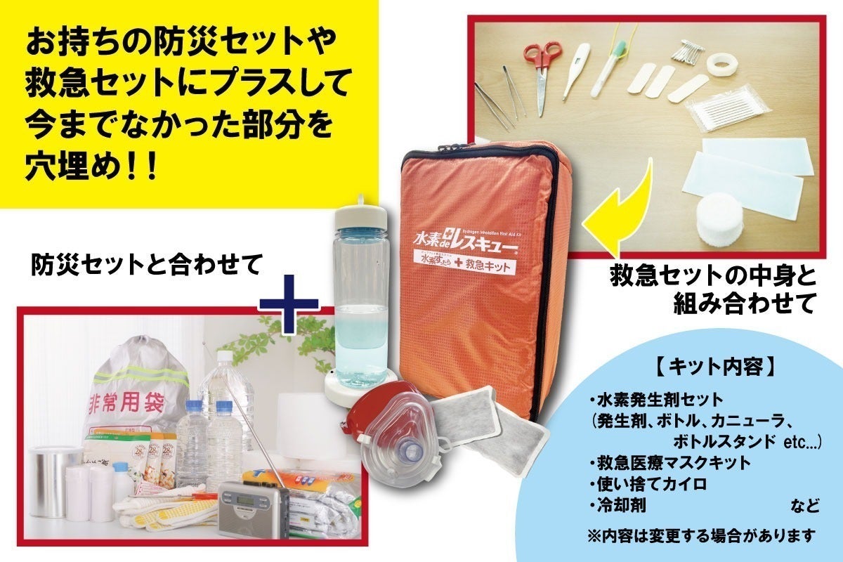 水素吸入キットだけでなく救急マスクやカイロ、冷却剤なども中に入っているので、お持ちの防災キットと組み合わせれば災害時も安心です。