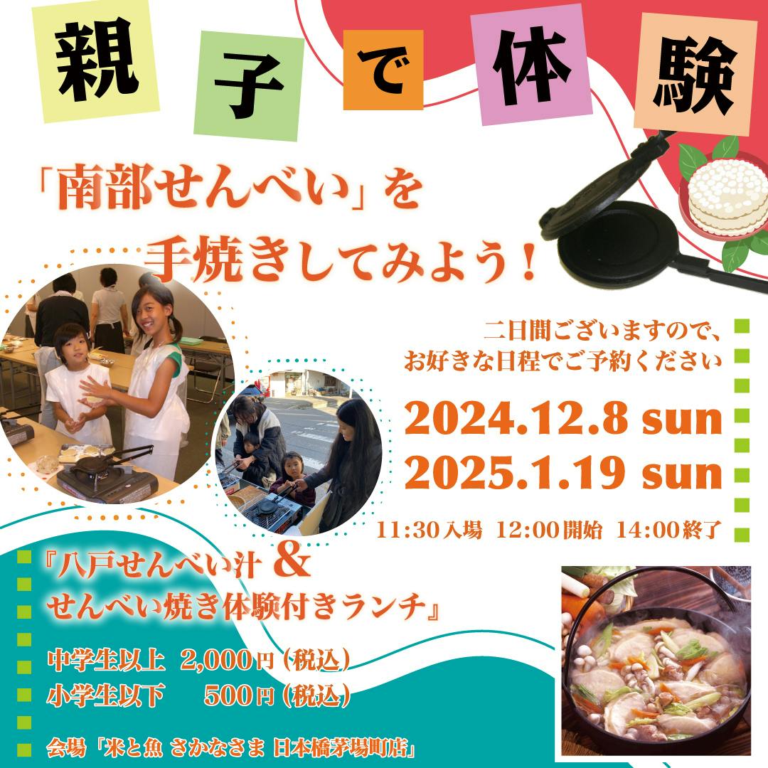 「米と魚 さかなさま 日本橋茅場町店」で12/8(日)の昼、「南部せんべい」を手焼きしてみよう!『八戸せんべい汁&せんべい焼き体験付きランチ』~八戸の食と観光を楽しむ会~を開催しました!