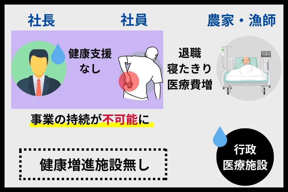 企業、住民、行政、医療施設の連携が取れておらず、退職や寝たきり、医療費増につながっている状況。人手が不足することで事業の持続も不可能になる恐れがあります。