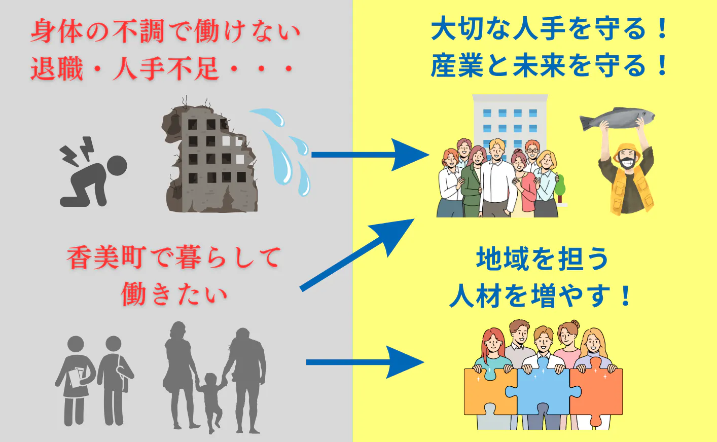 例えば、兵庫県にある人口1.5万人、高齢化率4割超の香美町(かみちょう)。ここは松葉ガニや但馬牛などの特産品で知られており、観光業や水産業、農業を初め、いろんな産業で人々が働いています。