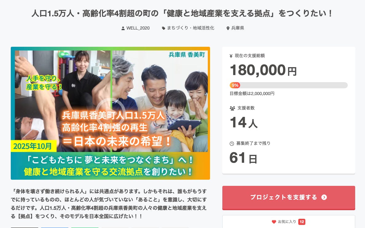 クラウドファンディング開始から16日が経過し、現在14名のあなたから180,000円のご支援をいただいております。「お気に入り登録」での応援もありがとうございます!