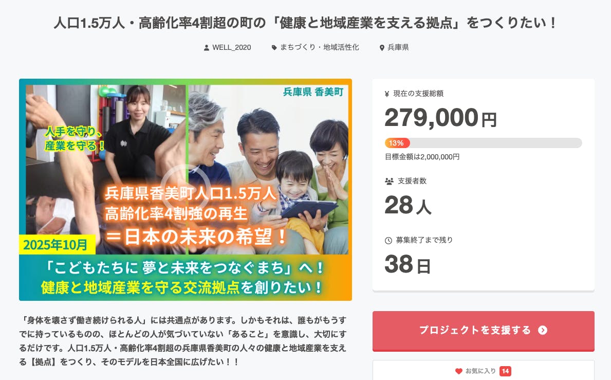 現在クラウドファンディング開始から39日が経過し、現在28名のあなたから279,000円のご支援をいただいております。ありがとうございます!