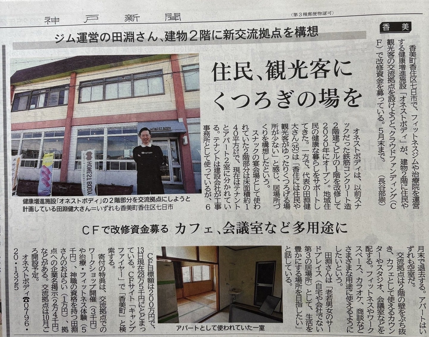 紙面では、現在進めているクラウドファンディングの背景や、2階を地域の交流拠点に改修しようとしている想い、観光客や住民にとって“くつろげる場”をつくりたいというビジョンなどを、丁寧に紹介していただきました。