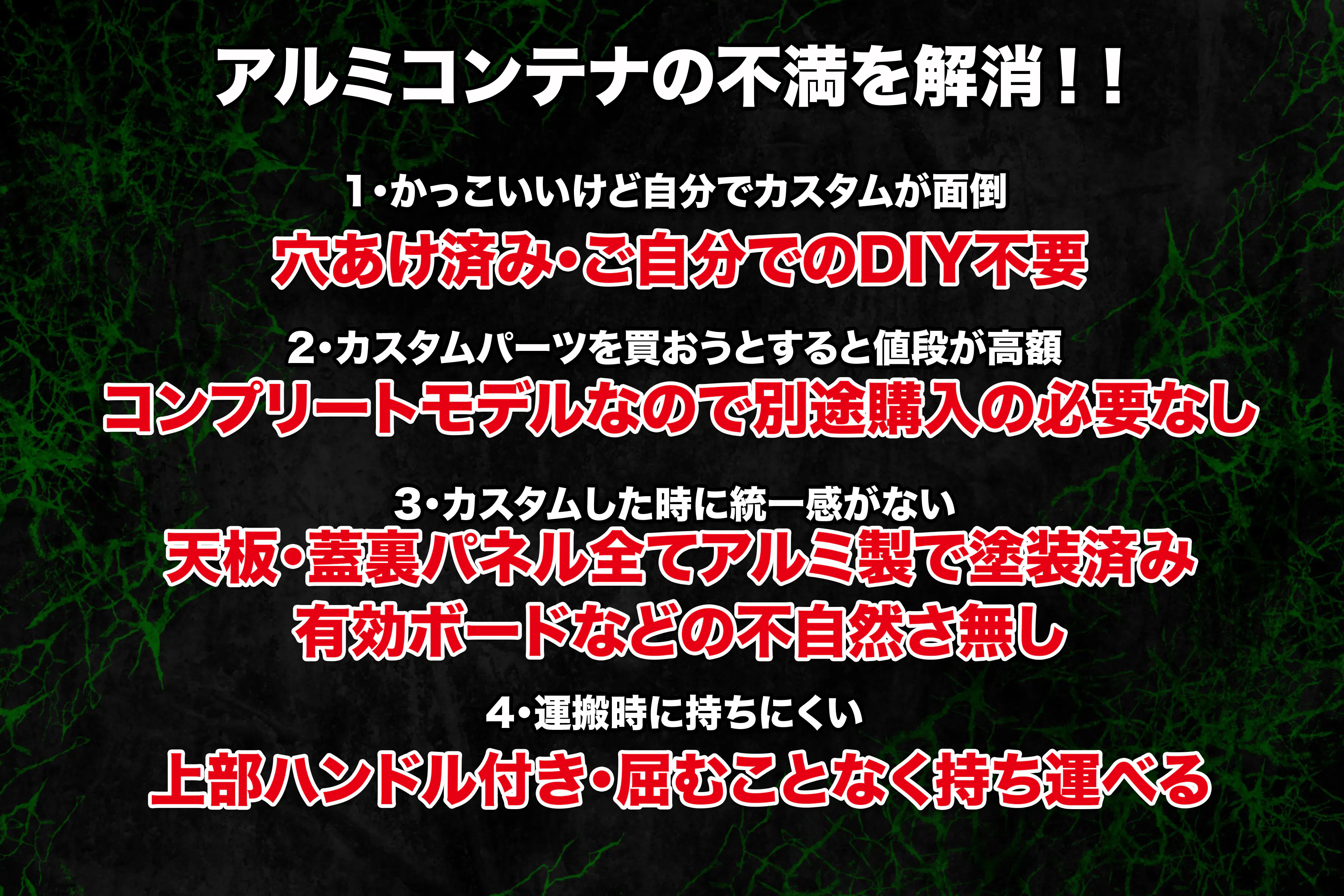 一般的なアルミコンテナはご自身でのカスタムが大変です、コンプリートモデルとなっているので面倒なDIYは不要!