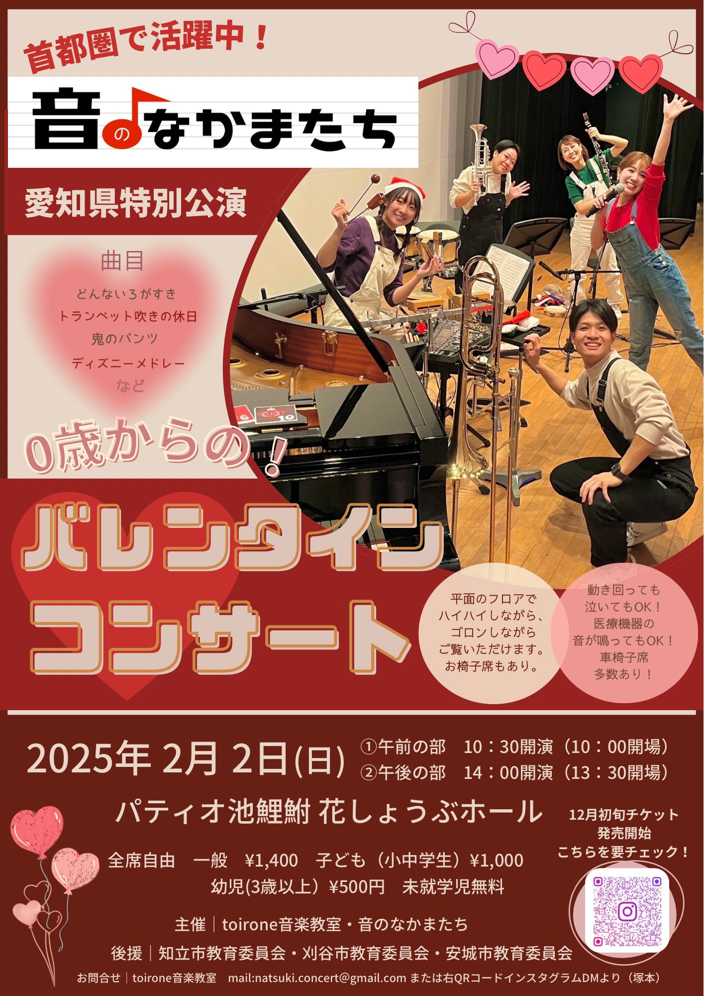 2025年2月2日に、学生時代から一緒に活動をしてきた仲間を地元愛知県に呼び、0歳からのバレンタインコンサートを企画しています。毎年児童発達支援事業所でコンサートをしており、毎年楽しみにしていただいております。一般チケットサイトもありますが、こちらで支援していただくことで、開場の15分前にお入りいただくことができ、お好きなお席を選べ、列ができる前にフォトブースで記念撮影ができます。