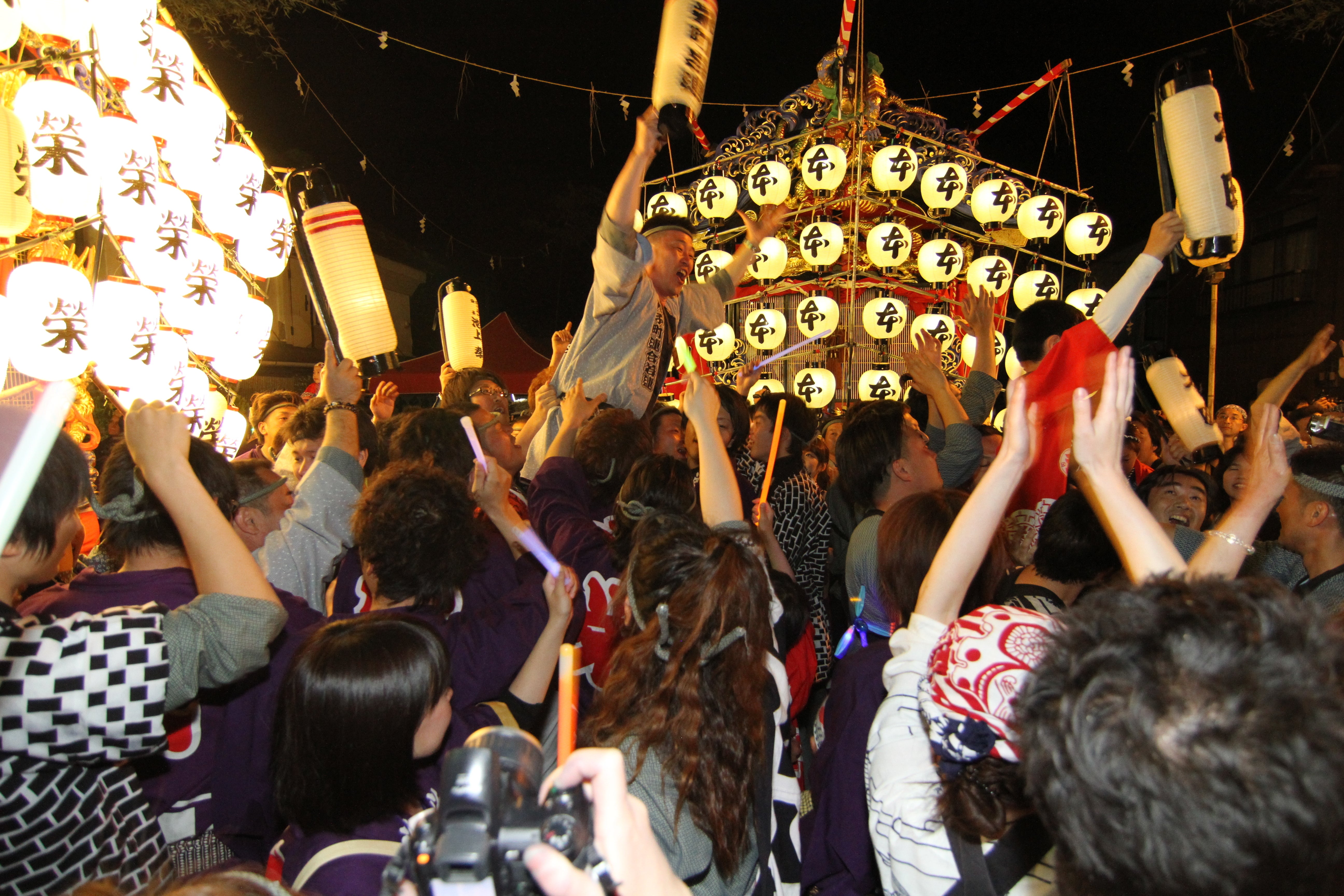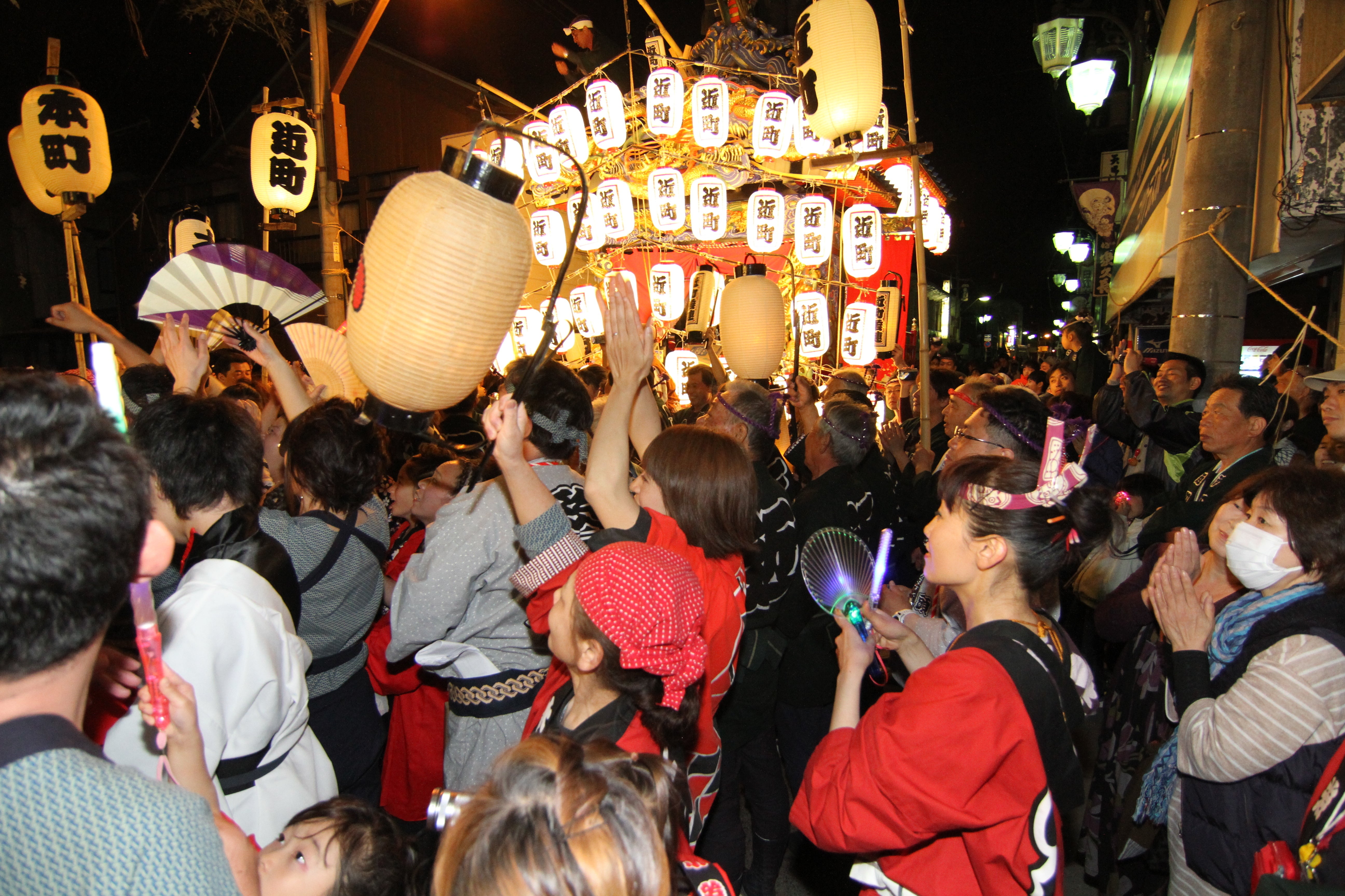 屋台に乗り込んだ囃子方は、威勢の良い祭囃子を奏でます。夜になると、7台の屋台が常陸大子駅前に集合し、囃子の競演となり、祭りのボルテージは最大になります。