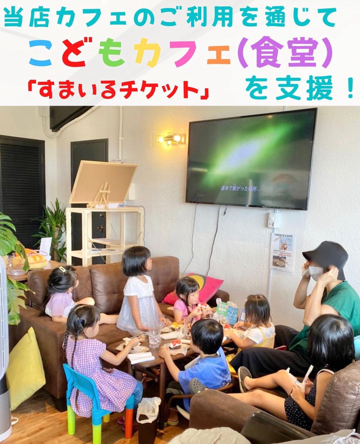 TREE's CAFEでは、食事を通じて地域に貢献できる「スマイルチケット」システムを導入しています。 食事代1,000円ごとに自動で1枚の「スマイルチケット」が発行され、15歳以下の子どもたちはこのチケットを使って、デザートや飲み物、カレーやタコライスなどの対象メニューから1つを無料で楽しむことができます。 チケットは飲食以外にも、200円で購入して寄付することが可能です。 さらに、子どもたちから寄付者に向けた感謝のメッセージを掲示板で掲載するなど、寄付する側もされる側も心温まる活動を推進しています。