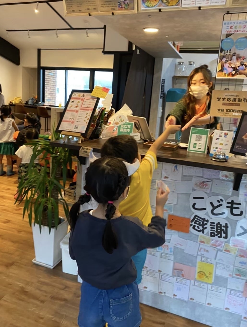 TREE's CAFEでは、食事を通じて地域に貢献できる「スマイルチケット」システムを導入しています。 食事代1,000円ごとに自動で1枚の「スマイルチケット」が発行され、15歳以下の子どもたちはこのチケットを使って、デザートや飲み物、カレーやタコライスなどの対象メニューから1つを無料で楽しむことができます。 チケットは飲食以外にも、200円で購入して寄付することが可能です。 さらに、子どもたちから寄付者に向けた感謝のメッセージを掲示板で掲載するなど、寄付する側もされる側も心温まる活動を推進しています。