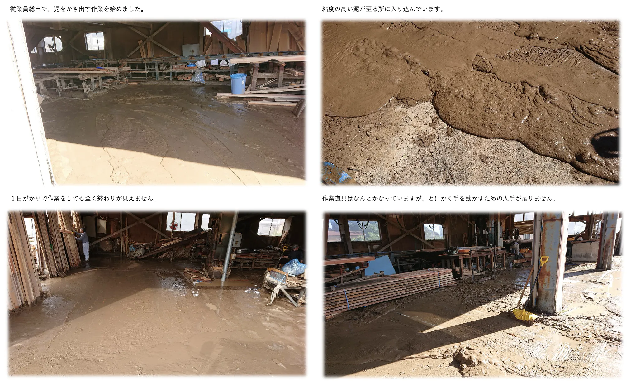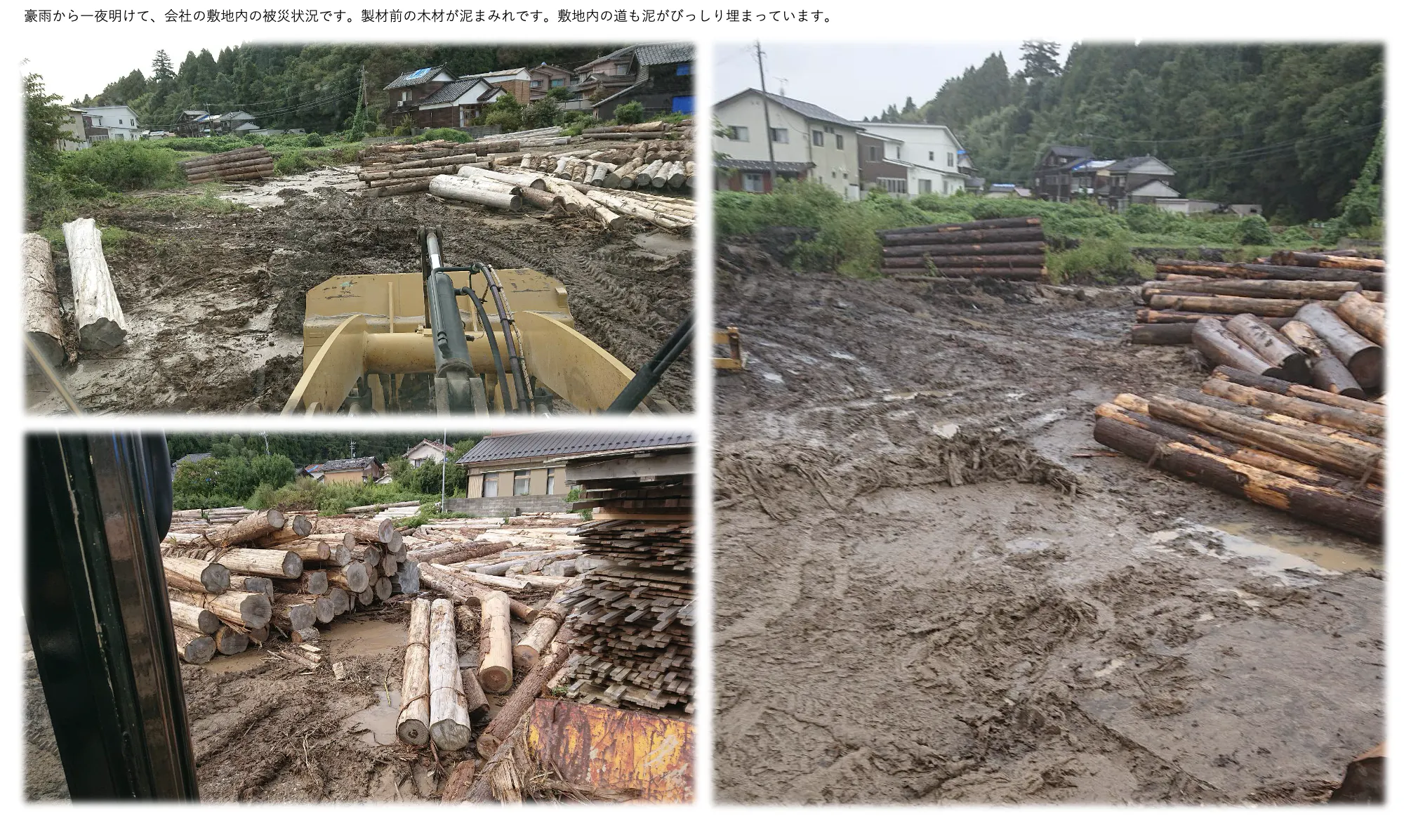 弊社は2024年1月の能登半島地震、2024年9月の能登半島豪雨にて甚大な被害を受けました。特に豪雨以降は製材業務が全てSTOPしており、毎日従業員親戚一同総出で復旧作業にあたっており、製材業務が何一つ行えていない状況にあります。