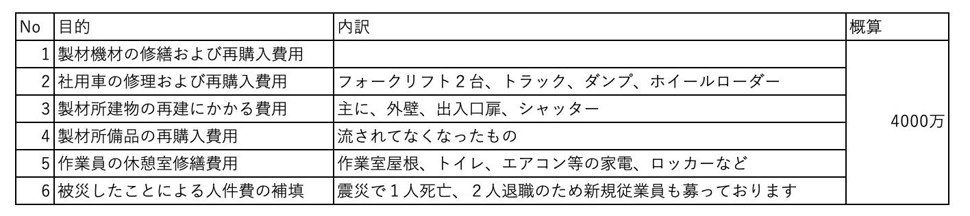 また、CAMPFIRE様 令和6年能登半島地震特別枠を設け、ご配慮いただきましたことに改めて心からの感謝を申し上げます。