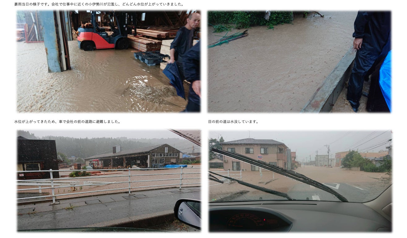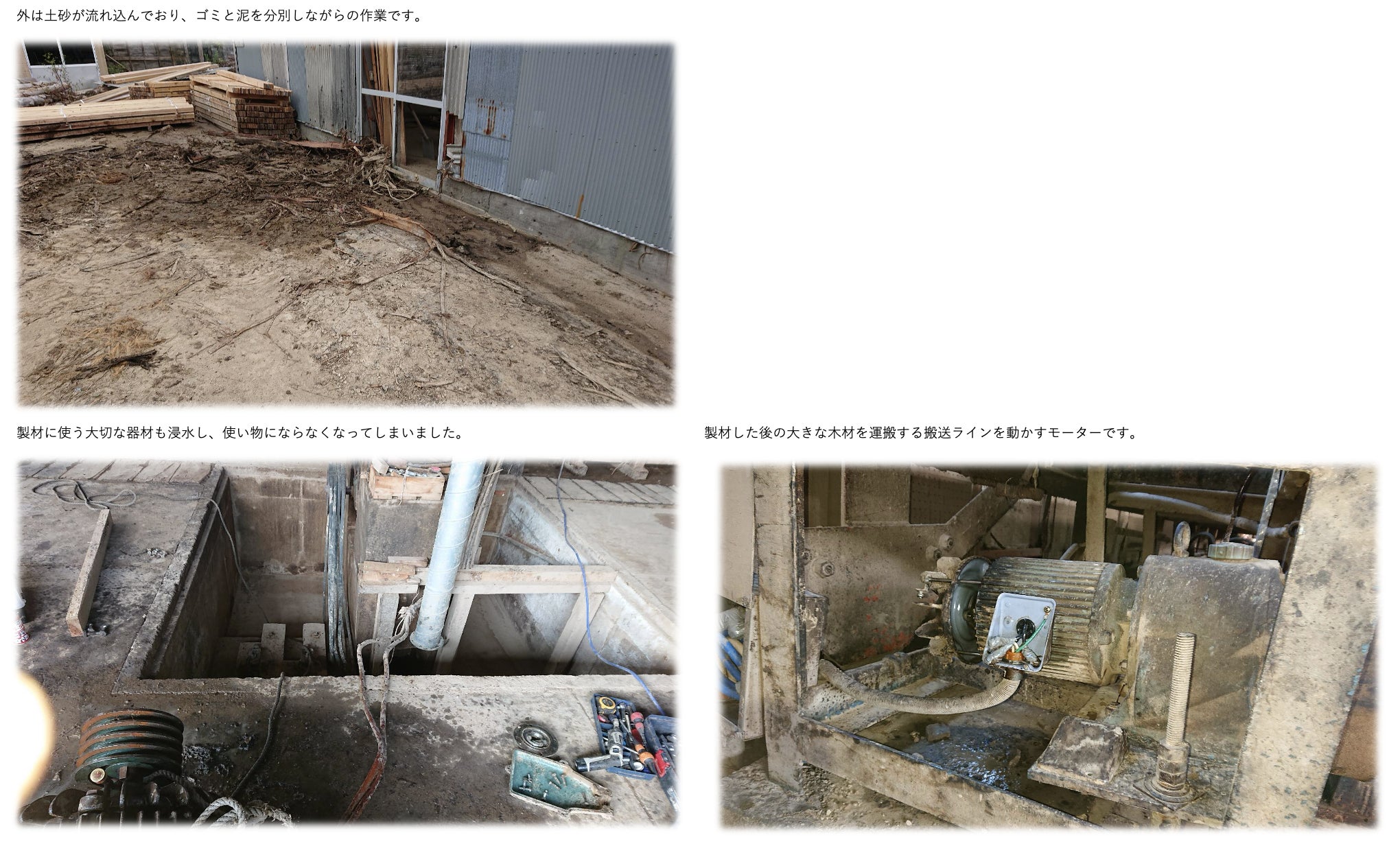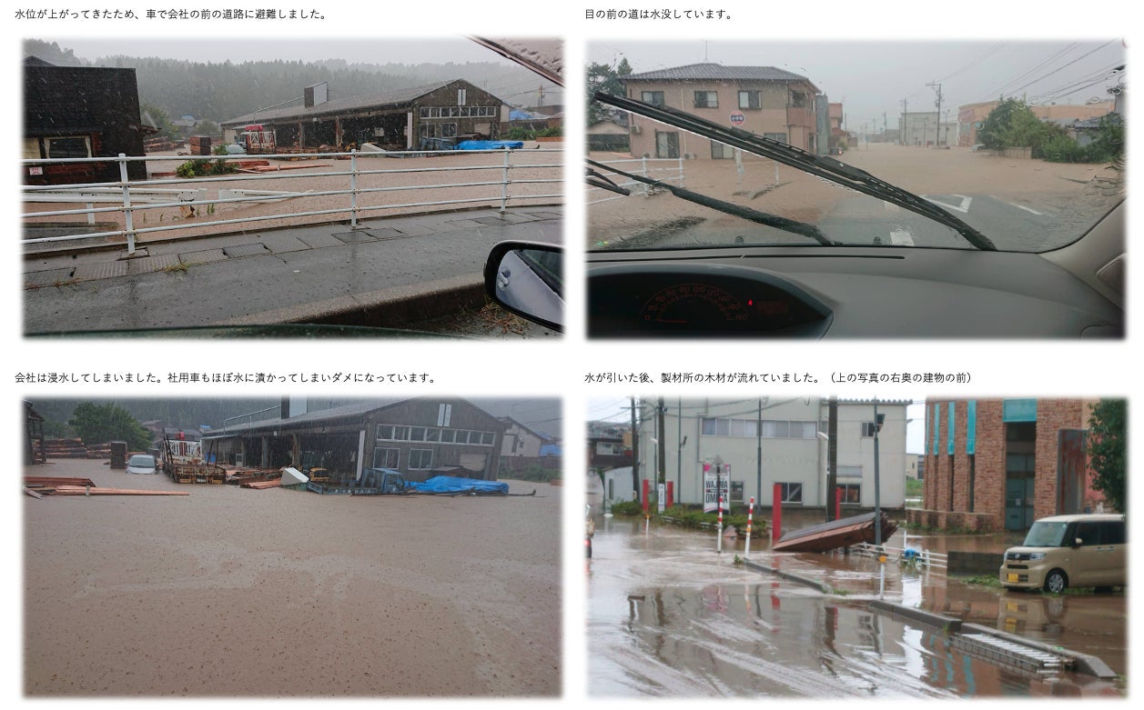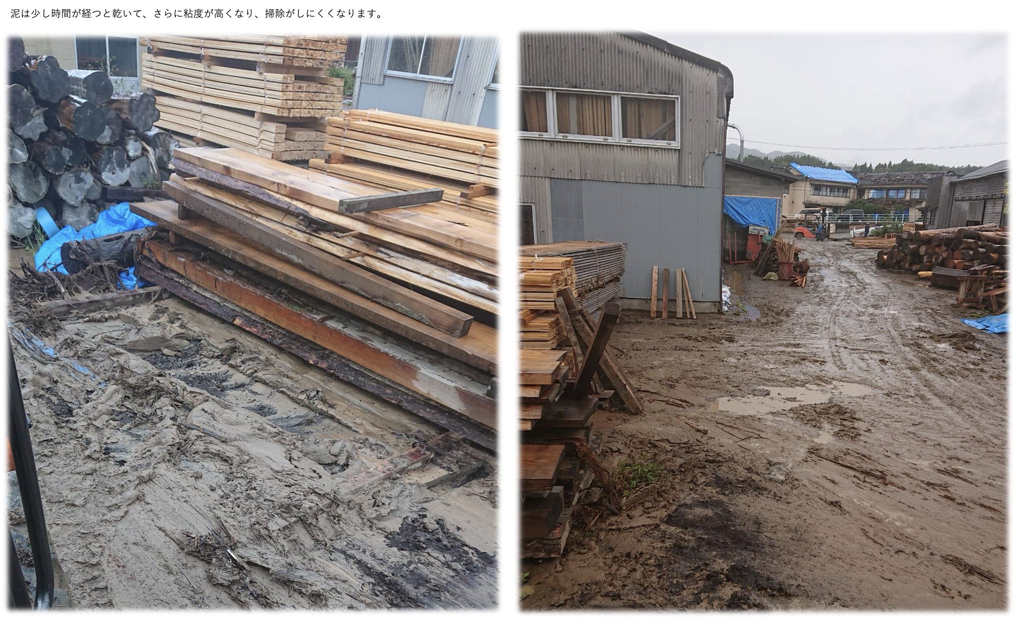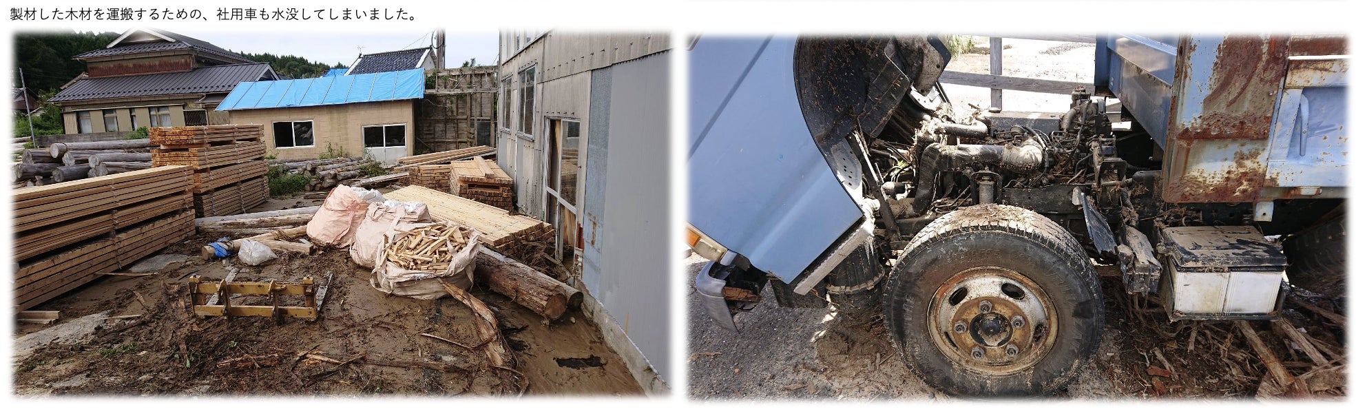 弊社は2024年1月の能登半島地震、2024年9月の能登半島豪雨にて甚大な被害を受けました。特に豪雨以降は製材業務が全てSTOPしており、毎日従業員親戚一同総出で復旧作業にあたっており、製材業務が何一つ行えていない状況にあります。