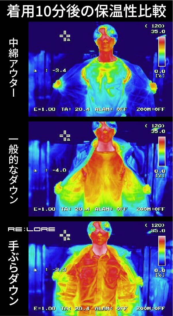 手ぶらダウン(左)は、内側の熱をしっかり保温していることが一目瞭然かと思います。