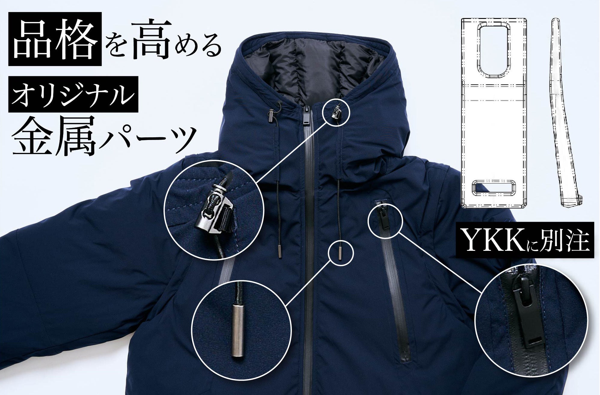 『THE WISDOM 2WAY DOWN PARKA』を一般的な商流(OEM会社経由)を使って、一般的な原価率(20%~30%)で設定すると15万円以上の定価になってしまうような"超"高付加価値商品です。