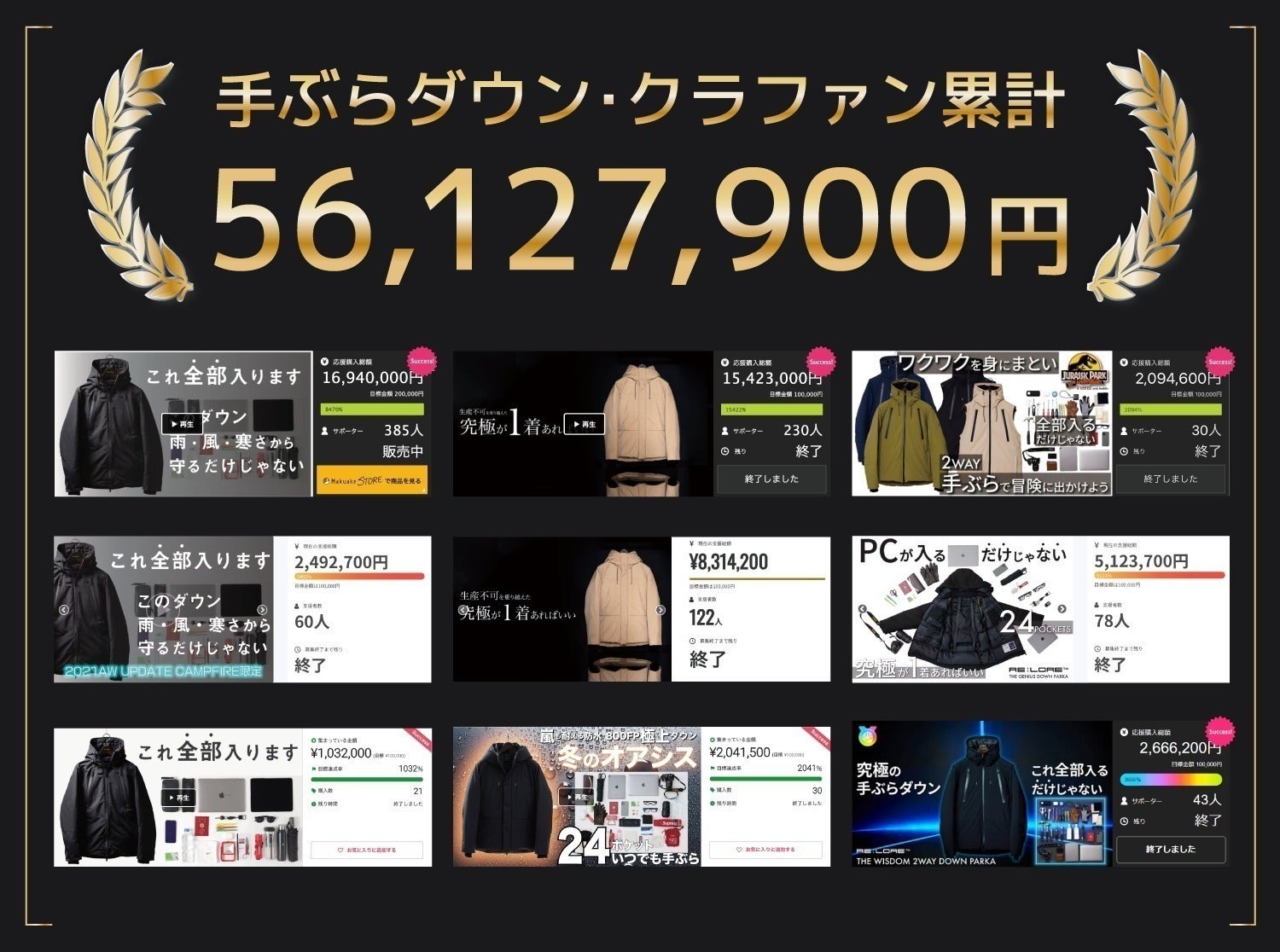 おかげさまで『手ぶらダウン』は、クラウドファンディングで累計56,127,900円のご支援をいただいております。