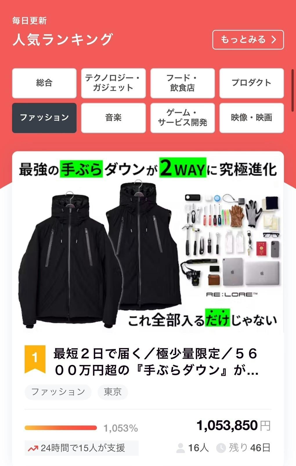 本日始まった『THE WISDOM 2WAY DOWN PARKA』のプロジェクトですが、おかげさまで、デイリーランキング1位を獲得することができました。