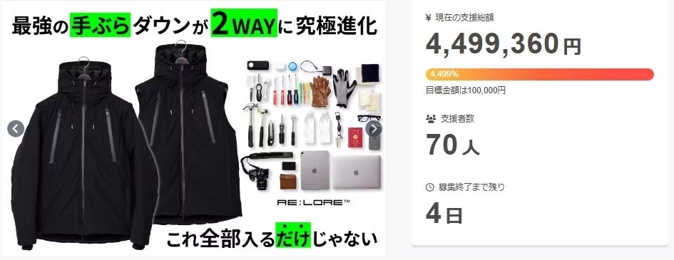 すでに累計6,000万円を超えるご支援をいただいている『手ぶらダウン』の最新作!