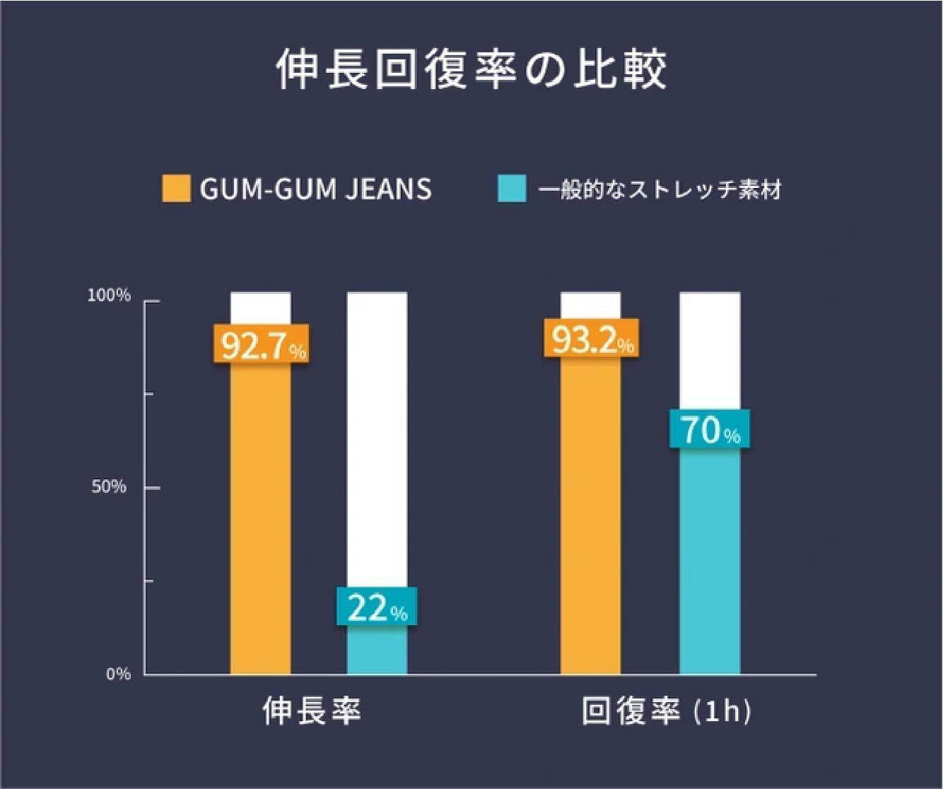 一般的なストレッチデニムの伸長率は15%〜30%程度ですが、GUM-GUM JEANSはその4倍以上、驚異の伸長率:92.7%を実現しました。