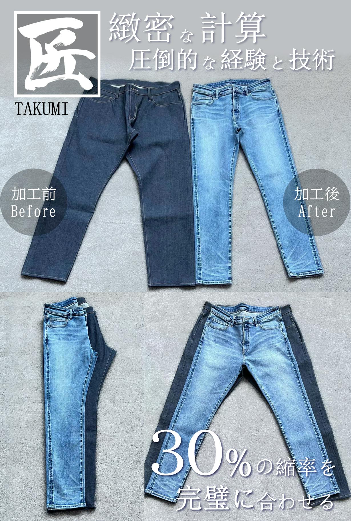 膝の前、脇、後ろと綺麗につながった穿きジワを忠実に再現した『匠の技』を是非ご堪能ください。
