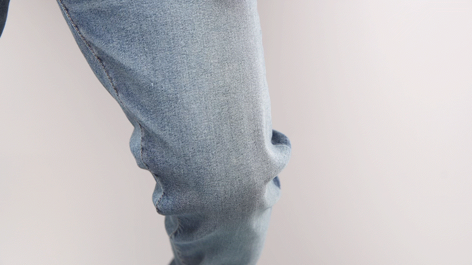 この強力なキックバック性(生地が元の状態に戻る力)は、スタイルアップ効果と同時にヒザ抜け(膝が伸びる)を軽減し、新品に近い状態(綺麗な脚長シルエット)を永くキープしてくれます!!