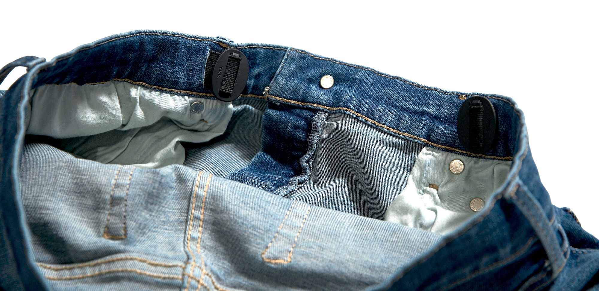 無段階調整できるYKKストッパーと専用ゴムを左右に1個ずつ(計2個)内蔵しているので、ベルト無しでもウエストにジャストフィットさせることが可能です。