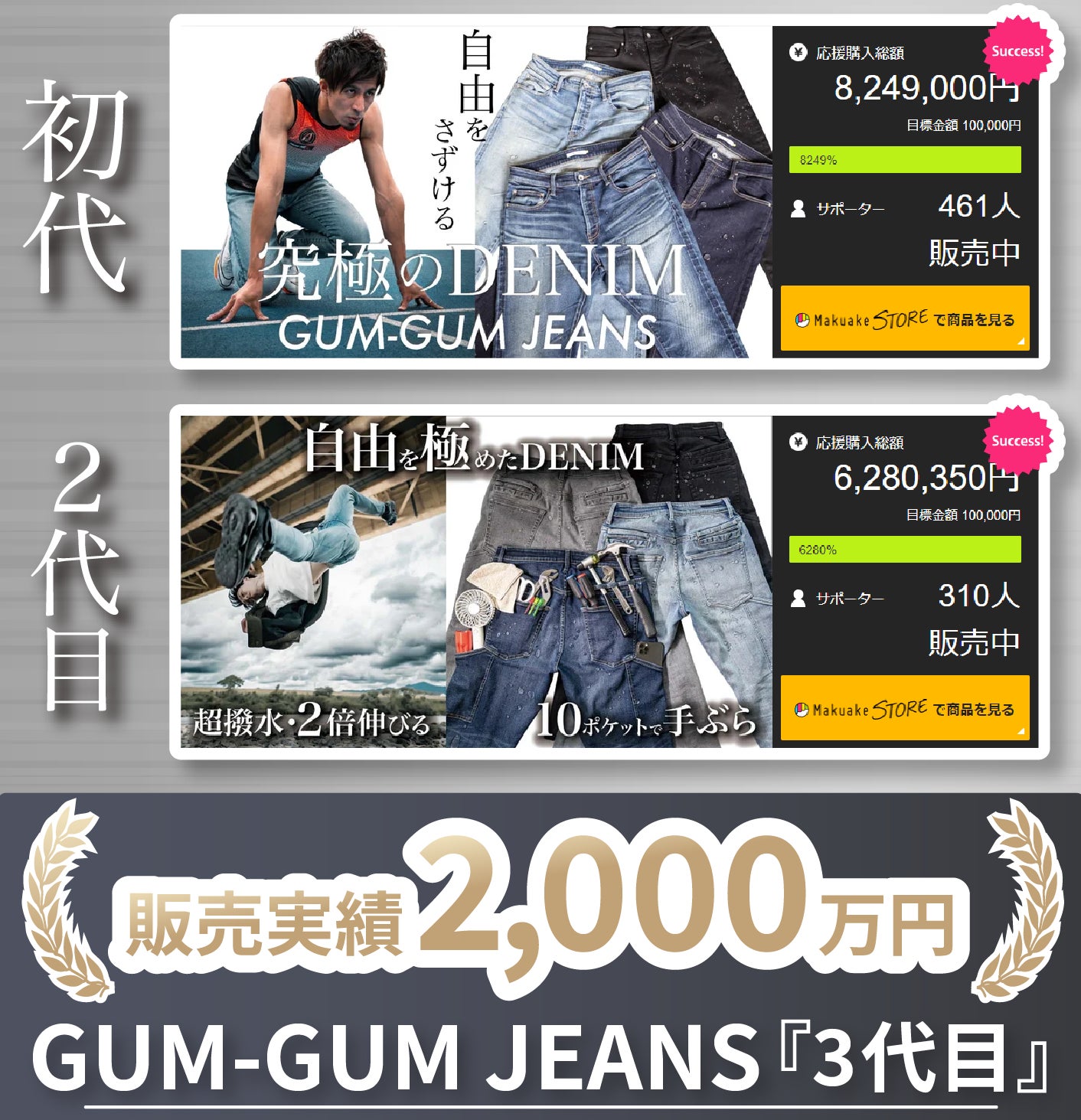 世界陸上メダリストの藤光謙司氏とコラボした2倍のび〜る最強ストレッチデニムパンツ!おかげさまで、GUM-GUM JEANSシリーズの販売実績は3,000万円!