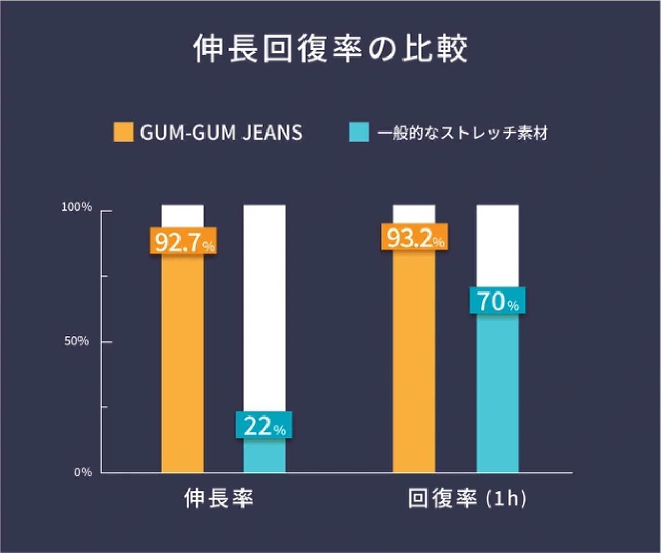 一般的なストレッチデニムの伸長率は15%〜30%程度ですが、GUM-GUM JEANSはその4倍以上、驚異の伸長率:92.7%を実現しました。