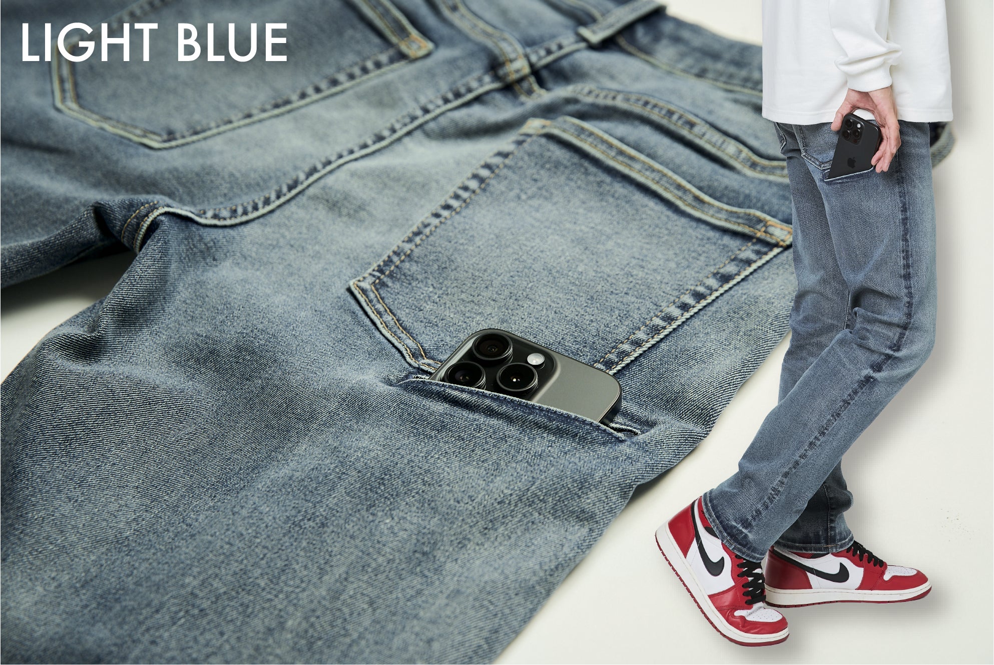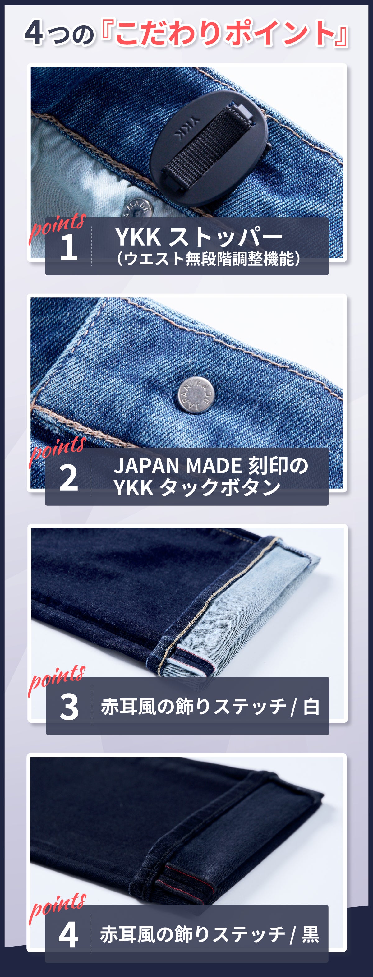 これらの経験と実績に基づき、「スマホ専用ポケット」と「ウエストの無段階調整システム」を新たに実装させ、現代社会にマッチした”次世代の快適性”を追求したデニムパンツ『GUM-GUM JEANS 3.0+』が誕生しました。
