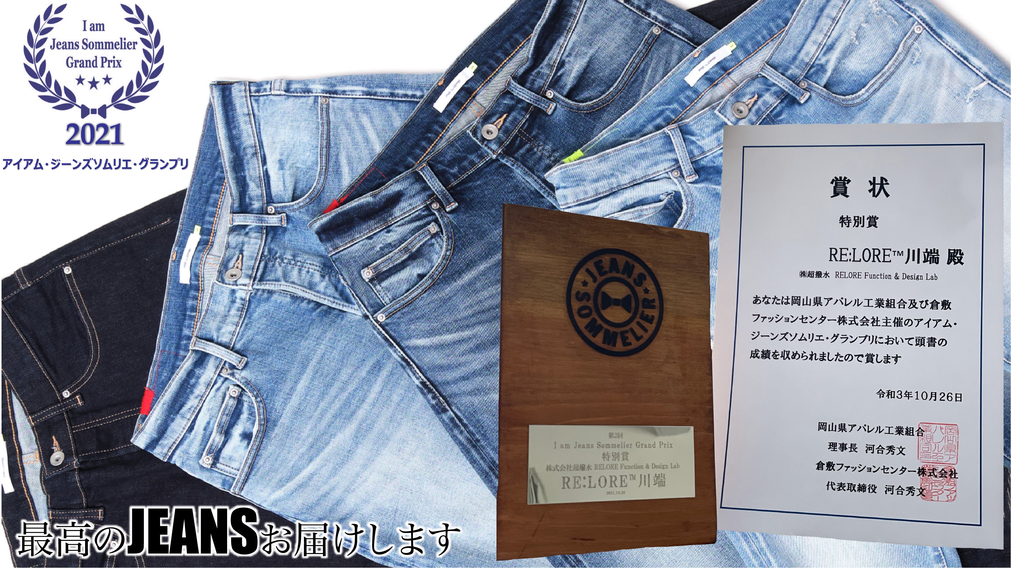 RE:LORE™の代表を務める川端は、2021年ジーンズソムリエ・グランプリにおいて『特別賞』を受賞しました。