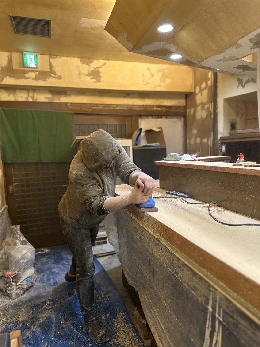カウンターは前の店を十数年支えていたので凹みが激しく、水平に直すためにサンダーでかなり削りました。木くず吸いすぎた。