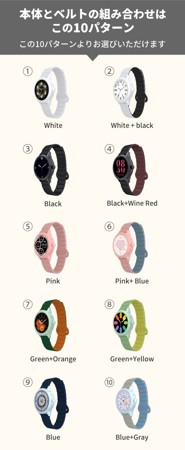 カラー:本体5色(Ceramic white,Mystic Black,Sakura Pink,Mint Green,Sierra Blue )、ベルト10色